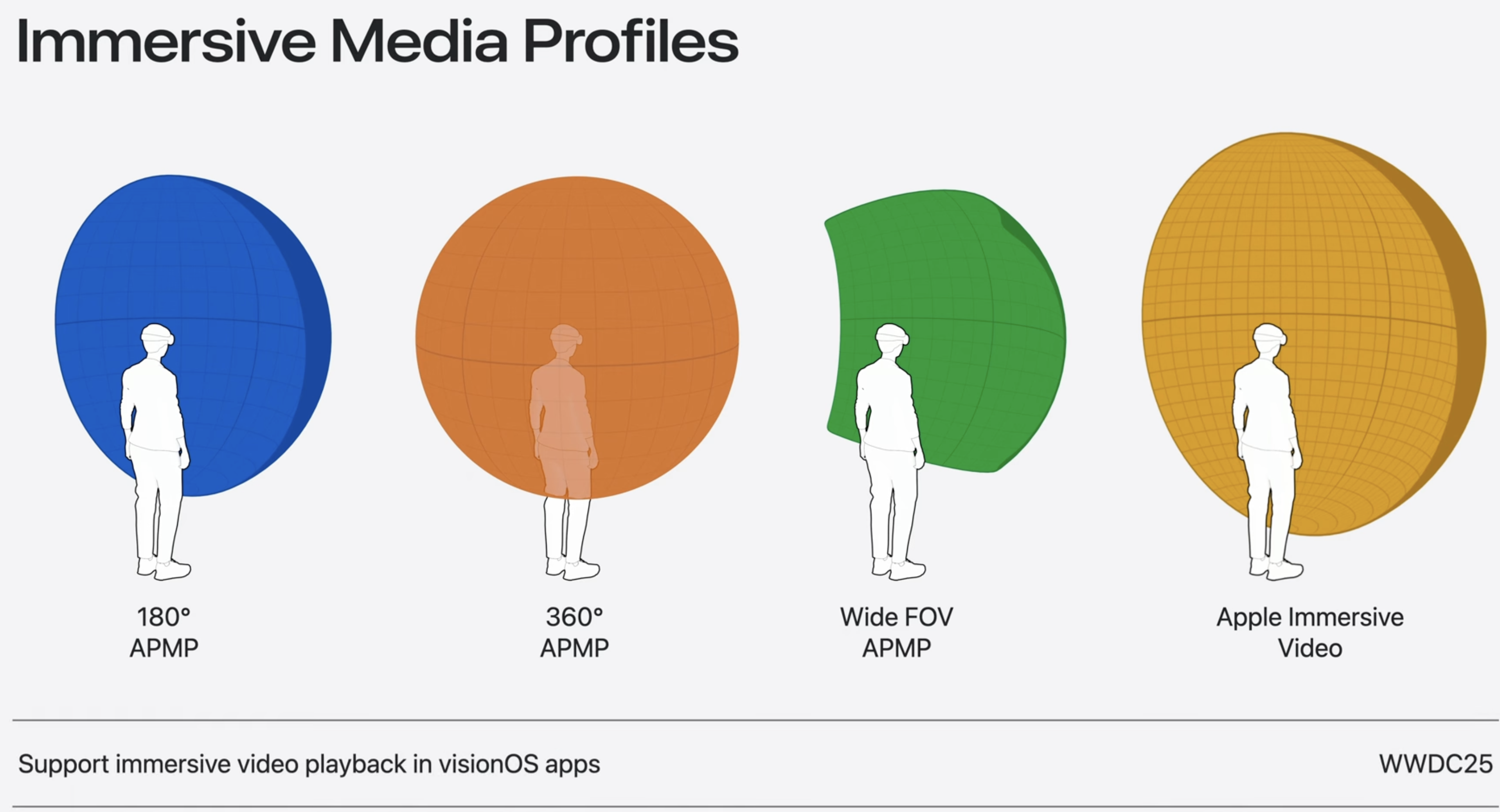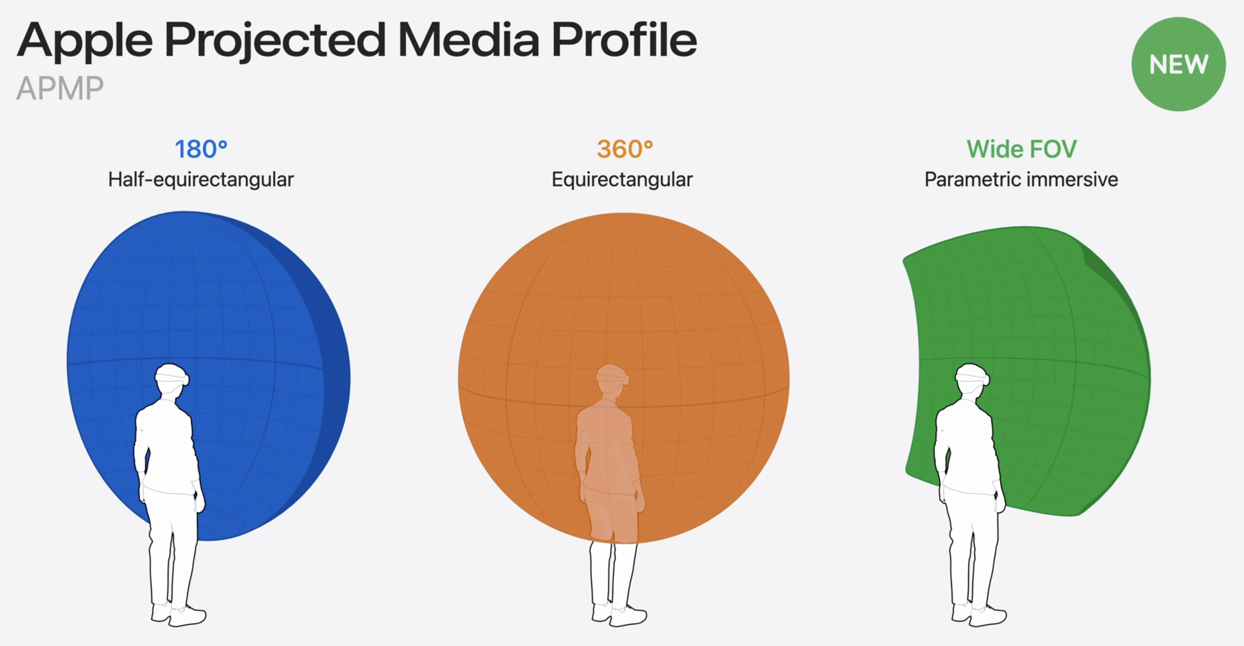 180도, 360도, 광시야각 비디오 등 Apple Projected Media Profile 비디오도 지원된다. 사용자는 APMP 비디오에 대한 편안함 설정을 구성할 수 있고, RealityKit은 이에 맞게 재생을 자동으로 조절한다.