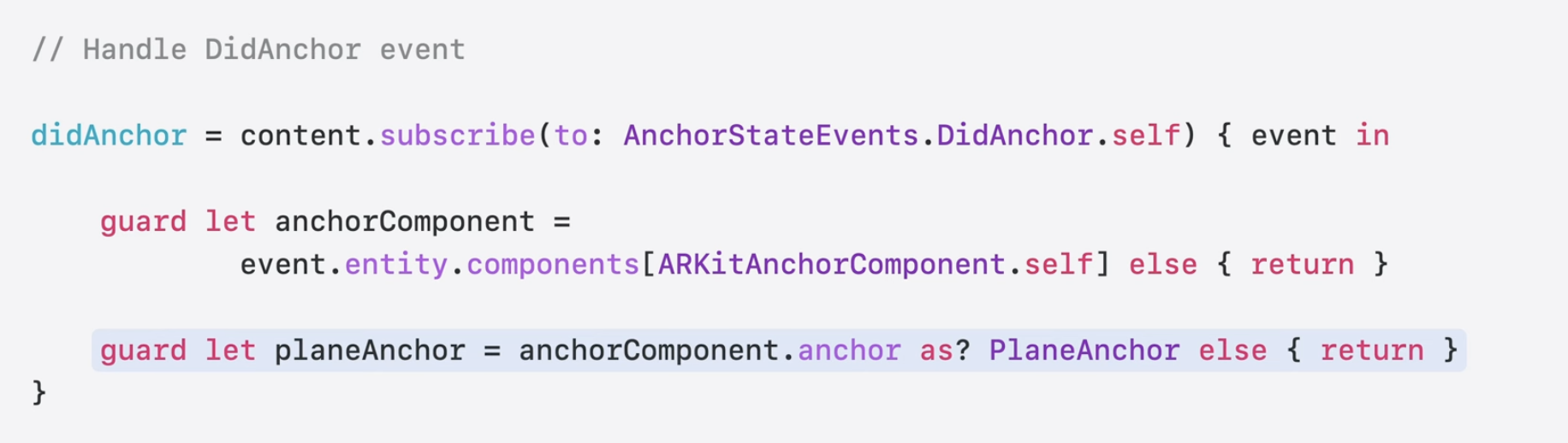 anchor property를 사용하려면 ARKit anchor type으로 변환해야 한다. 이 경우 AnchorEntity가 원하는 대상인 비행기를 찾도록 되어 있으니 PlaneAnchor로 캐스팅하겠다.