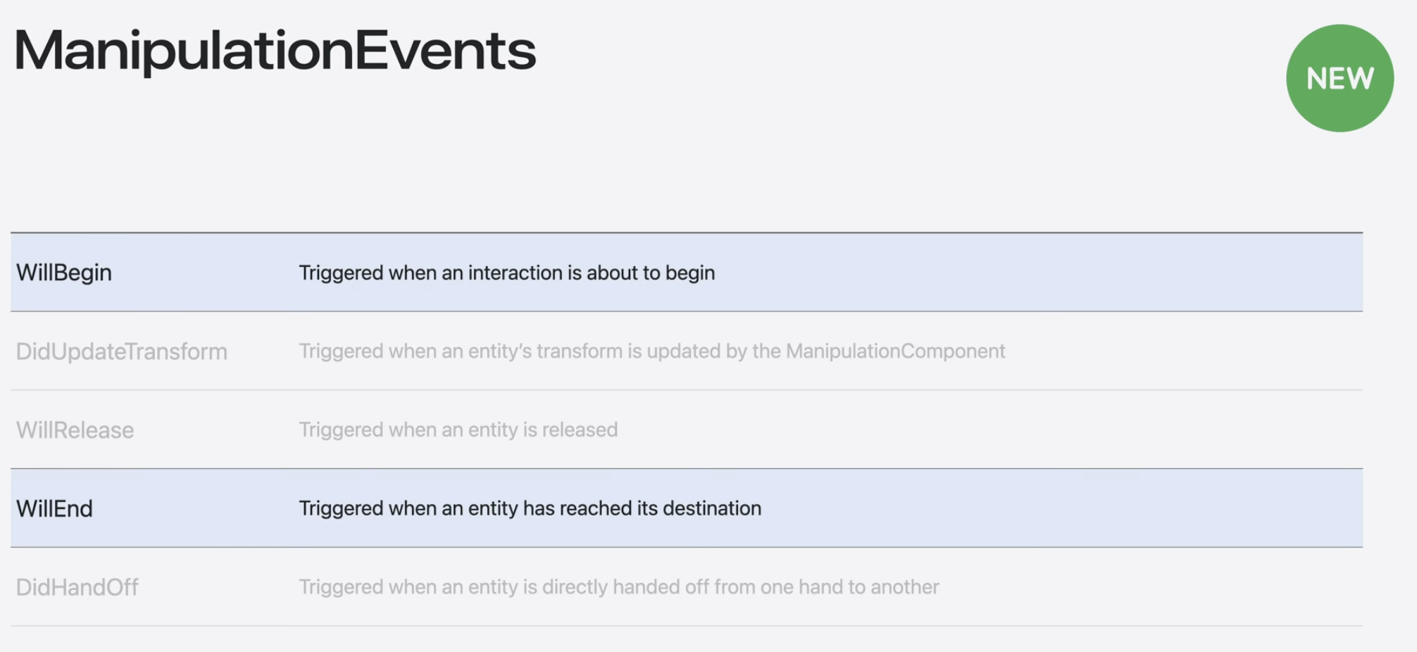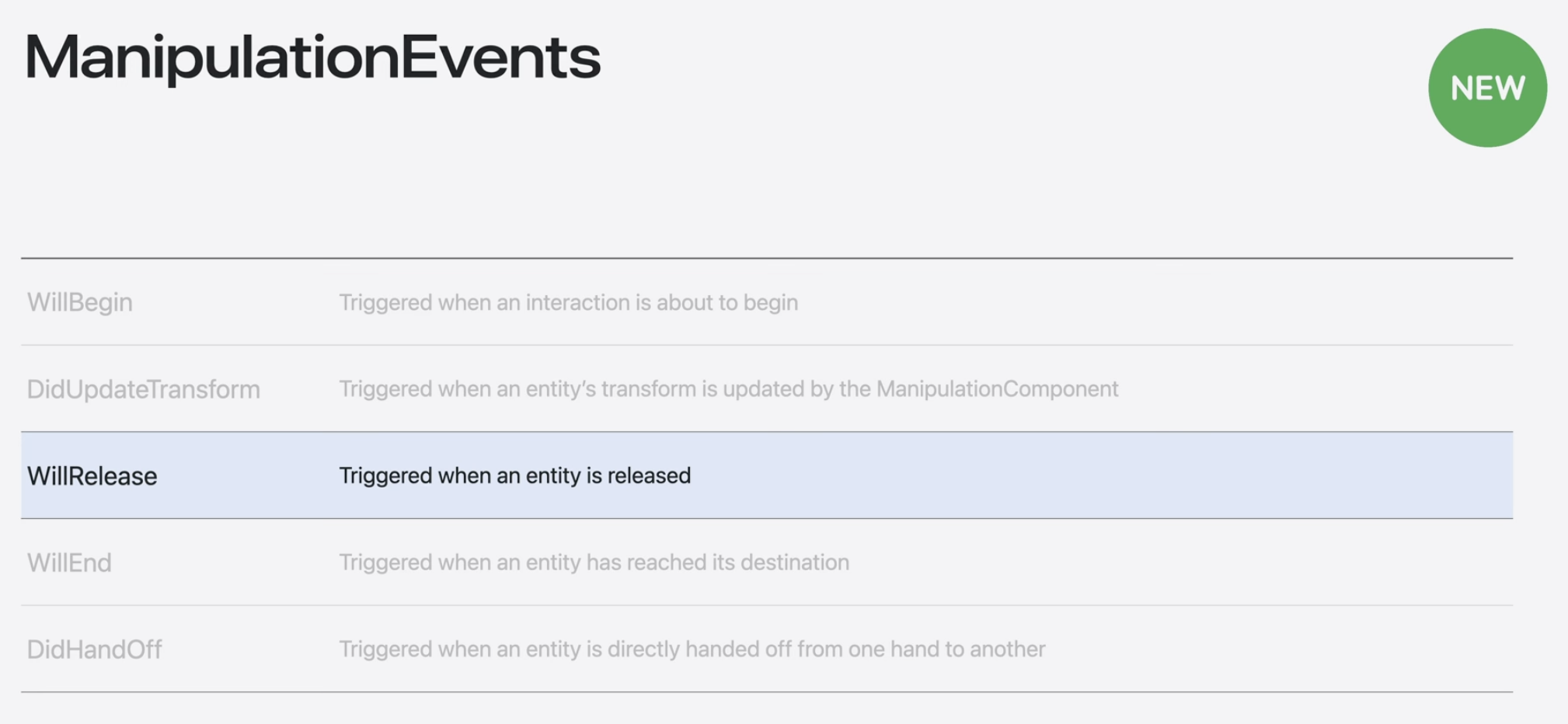 WillRelease event는 플레이어가 엔티티를 release 할 때 트리거 된다. WillBegin, WillEnd, DidUpdateTransform, DidHandOff도 있다.