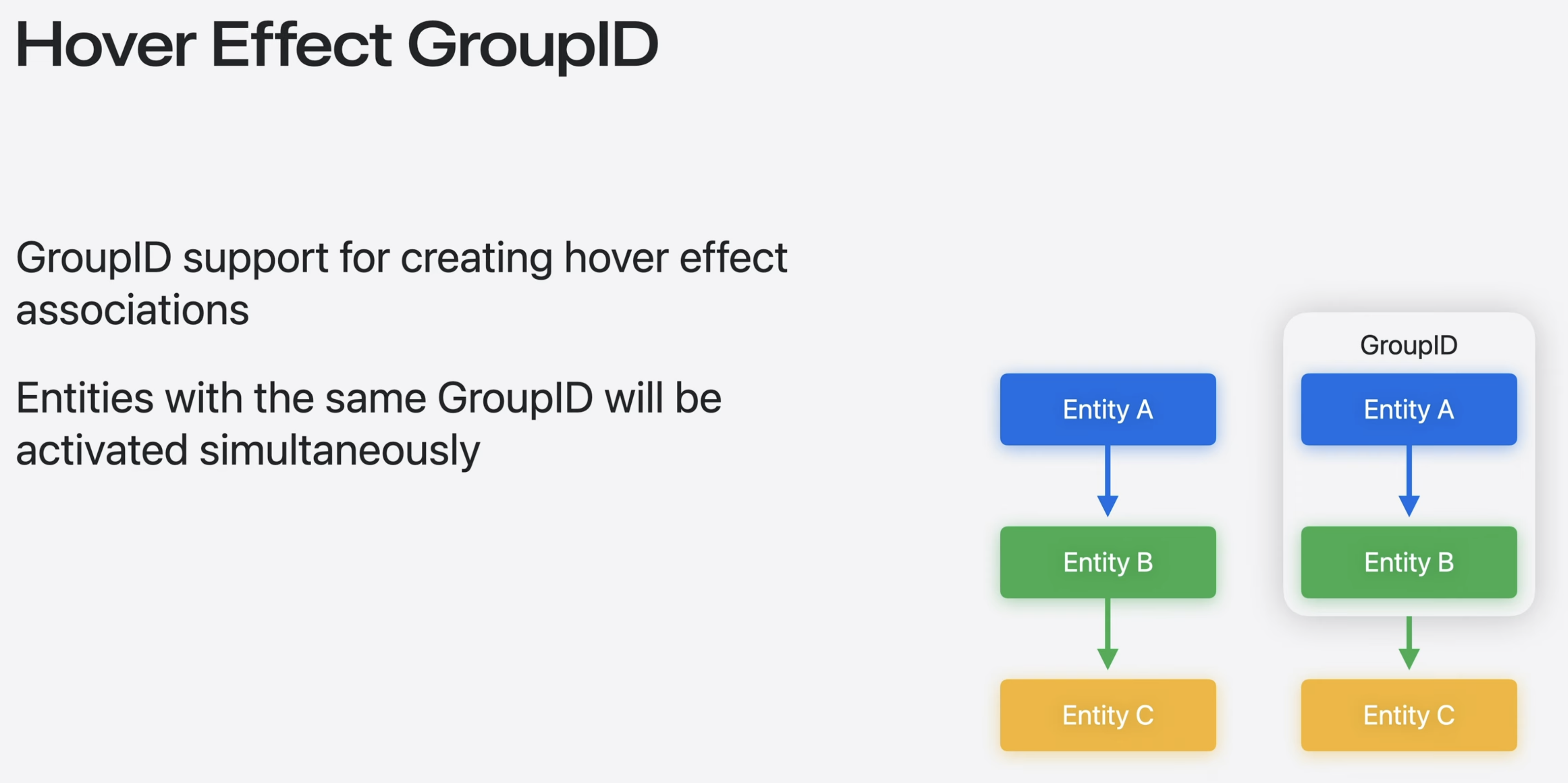 일반적으로 호버 효과는 왼쪽의 예처럼 계층적으로 작용하여 자식 엔터티는 부모 엔터티의 효과를 상속 받는다. 하지만 오른쪽 예처럼 A와 B가 같은 그룹 ID의 엔터티에 있는 경우 해당 엔티티는 자닛ㄴ의 효과를 자식 엔티티에 전파하지 않는다.