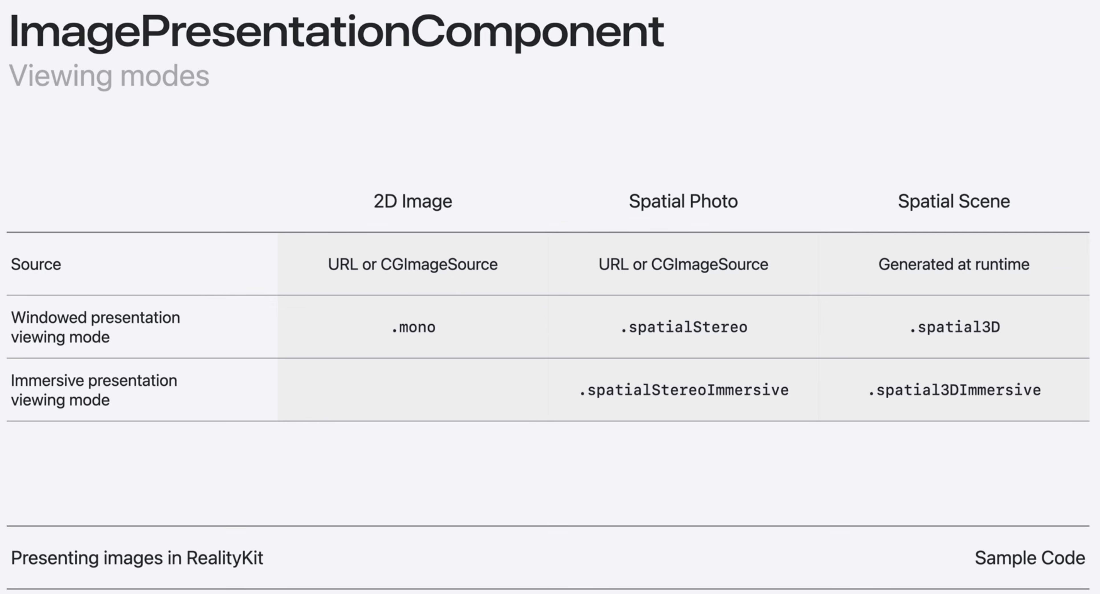 spatial photo에서 image presentation component를 만들 때마다 두 가지 spatial stereo mode를 모두 사용할 수 있다.