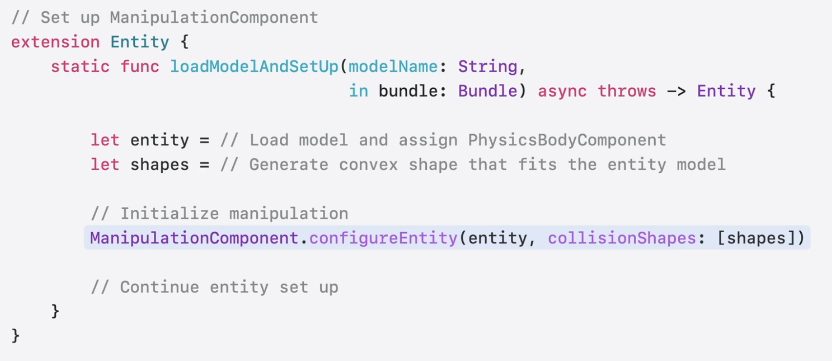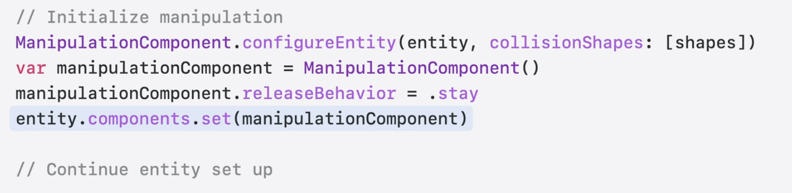 ManipulationComponent에 대해 더 알고 싶다면 "Better together: SwiftUI and RealityKit" 세션을 시청해라.