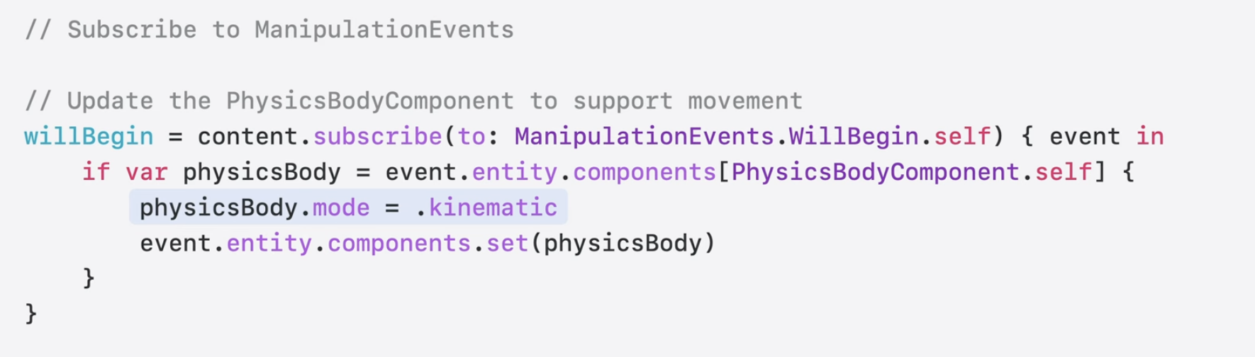 일단 WillBegin에 subscription을 추가하여 PhysicsBodyComponent 모드를 kinetic mode로 변경하여 객체가 이동하는 동안 물리 시스템이 방해받지 않도록 한다. 이렇게 하면 중력이 해당 entity에 영향을 미치는 것도 방지할 수 있다.