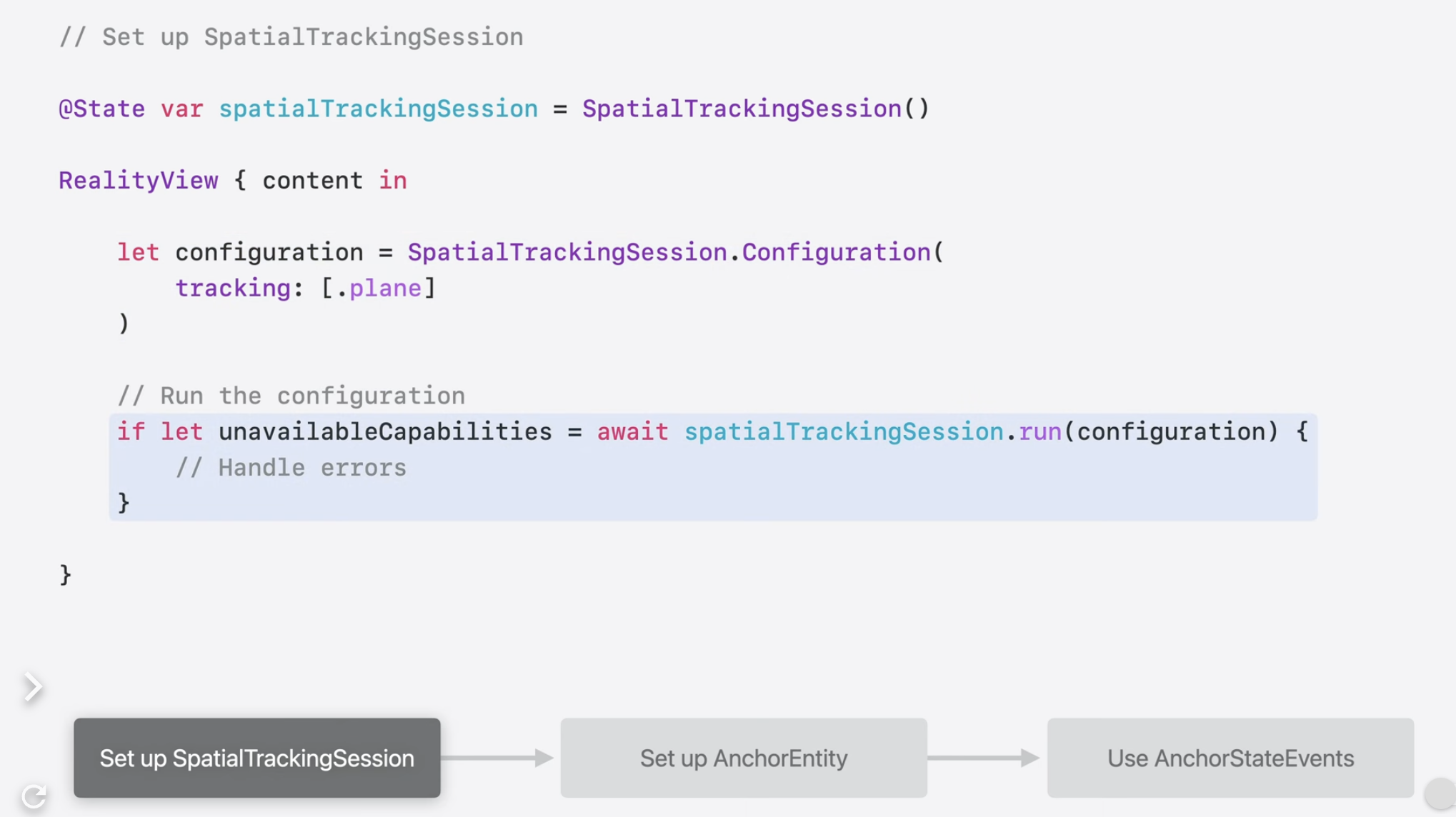 Session의 Configuration에서는 Anchor Entities에 대한 상태가 변경되면 RealityKit이 앱에 새로운 AnchorStateEvents를 보내도록 지시한다.