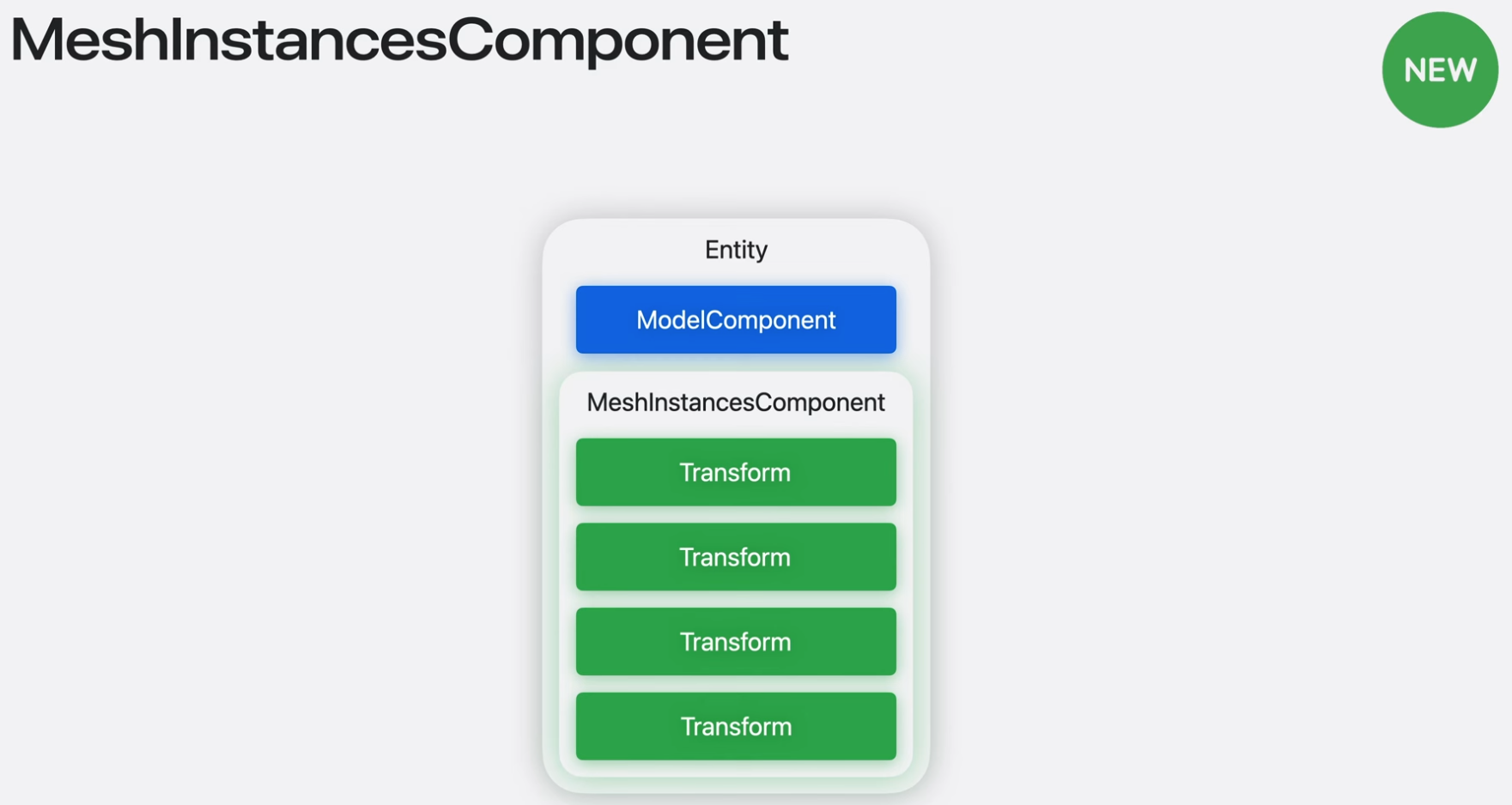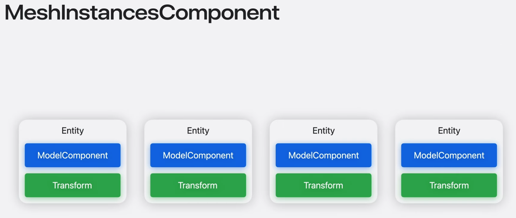 MeshInstancesComponent를 사용하면 단일 엔티티로 여러번 메시를 그릴 수 있다. mesh를 그리는 데 필요한 변환 목록만 제공하면 된다. iOS, iPadOS, macOS 및 tvOS에서는 LowLevelBuffer를 사용하여 렌더 데이터를 CustomMaterial에 전달하여 각 mesh instance가 unique하게 보이도록 할 수 있다. MeshInstancesComponent는 편리함 외에도 GPU로 전송해야 하는 데이터의 양을 줄여 성능을 향상시킬 수도 있다. 복제된 Mesh를 그릴 때 model과 material의 여러 사본을 GPU로 보내는 대신 MeshInstancesComponent는 해당 데이터를 한 번만 보낸다. single MeshInstancesComponent로 그려진 model은 여전히 단일 entity의 일부로 간주된다는 것에 유의하는 것이 중요하다.