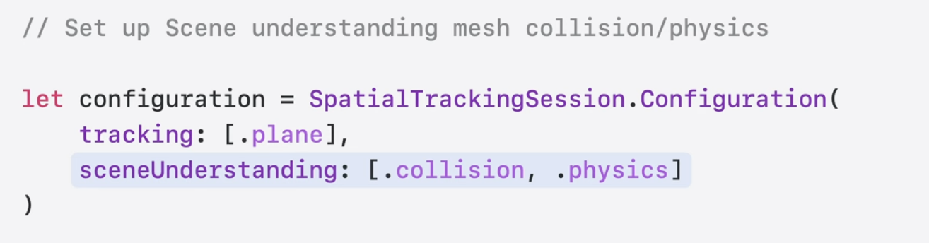 visionOS는 현재 collision과 physics flag를 지원한다. 이 두가지를 이용하여 게임 객체가 scene understanding 메시와 충돌하도록 할 것이다. 실행하기 전에 SpatialTrackingSession configuration에서 이 플래그를 설정한다.