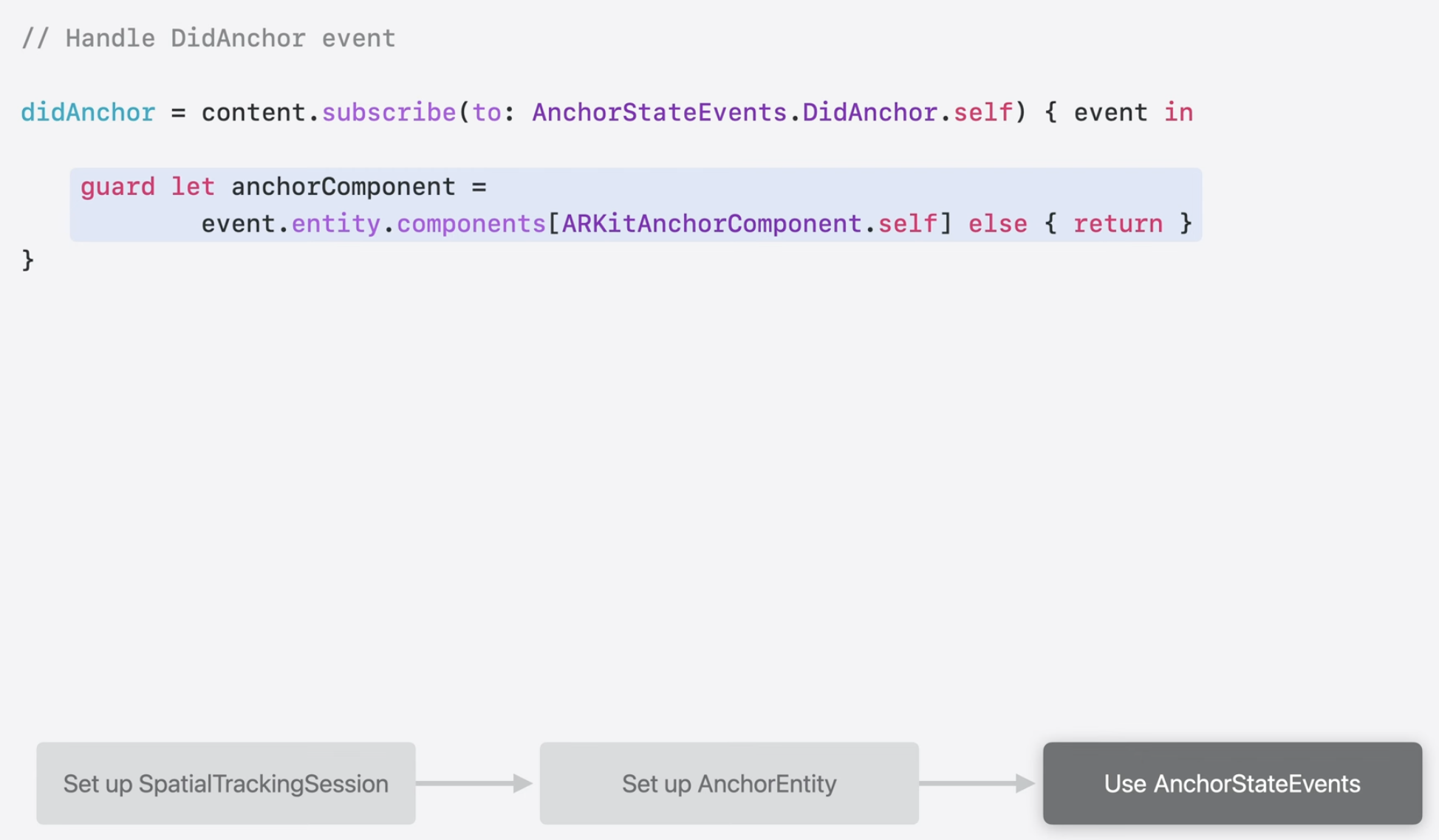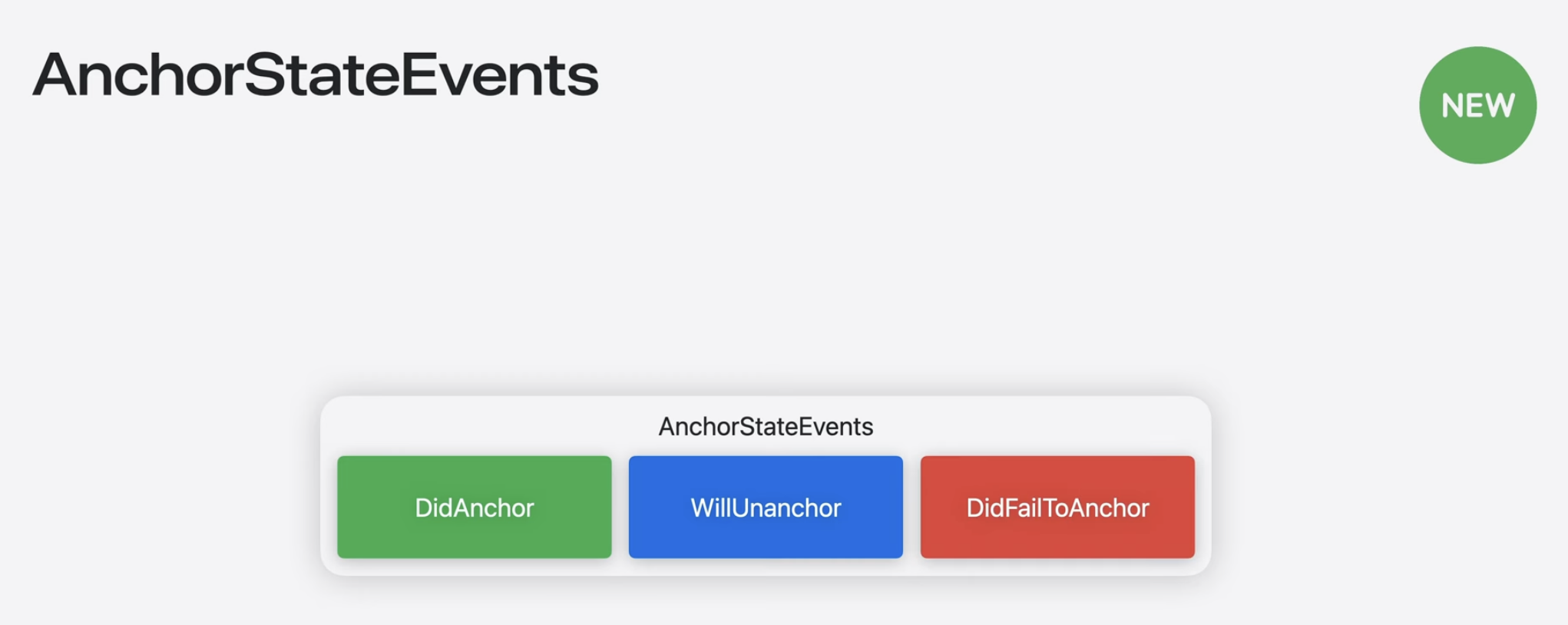 앵커 상태가 변경될 때 업데이트를 받으려면 AnchorStateEvent API를 사용해야한다. 이를 통해 엔터티가 앵커링 된 경우, 앵커링이 해제되려는 경우, 앵커링이 실패한 경우에 대한 이벤트를 구독할 수 있다.