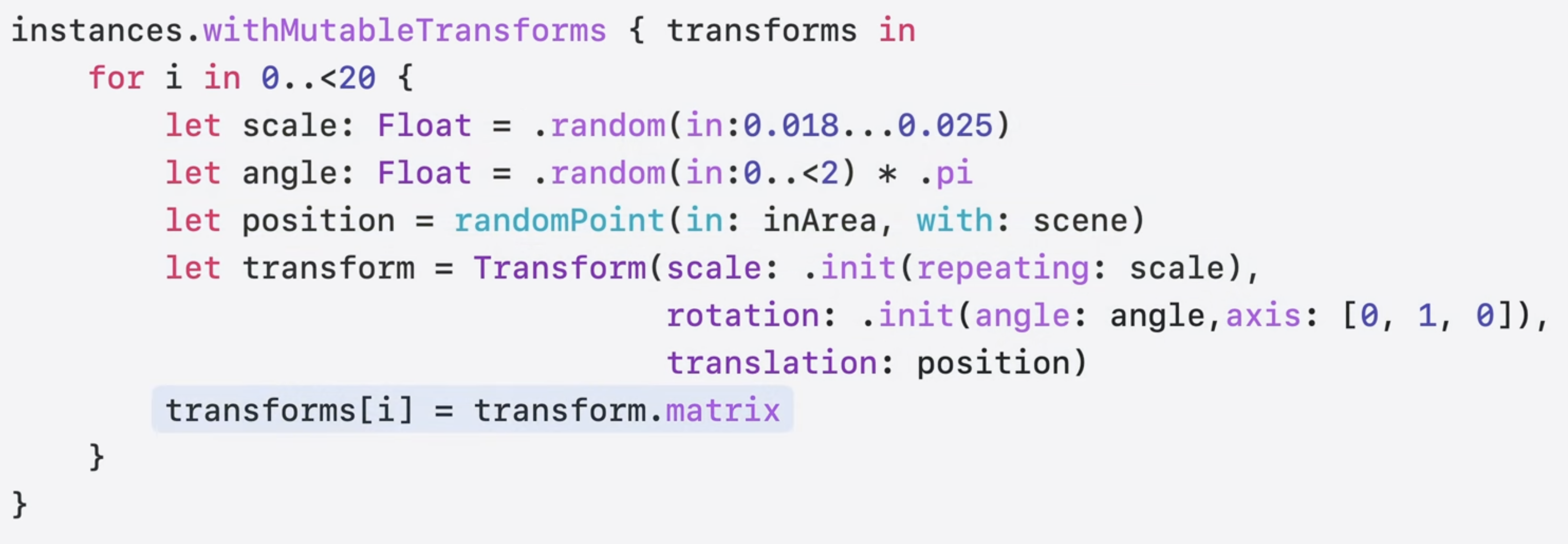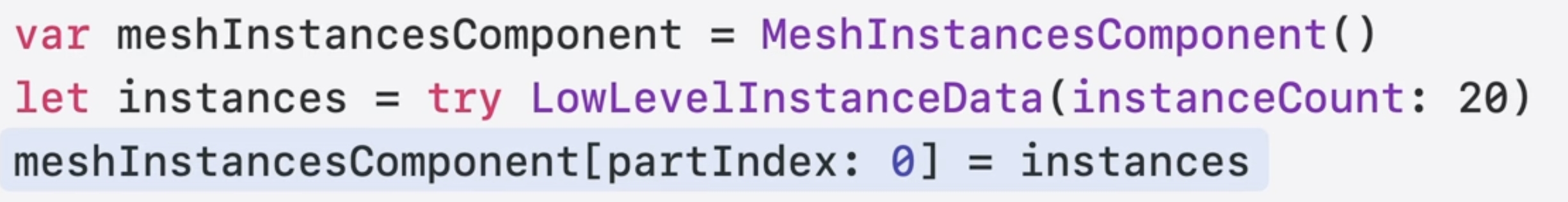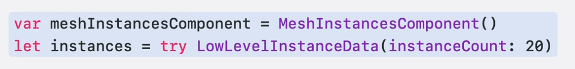 MeshInstancesComponent를 통해 주변 게임 영역에 장식을 추가할 수 있다. 작년에 LowLevelMesh 및 LowLevelTexture API가 RealityKit에 추가되어 랜더링 데이터를 훨씬 더 효과적으로 제어할 수 있게 되었다. 올해의 RealityKit 업데이트에서는 이러한 저수준 액세스가 렌더링의 또 다른 측면인 Instancing으로 확장되었다.