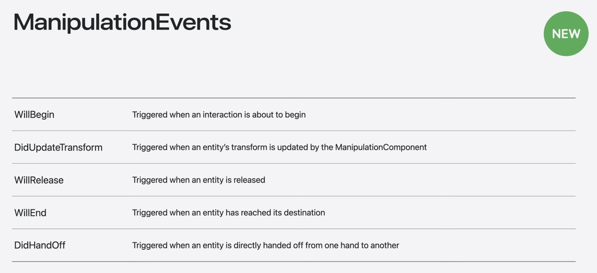 ManipulationEvents는 RealityKit에서 발생하는 이벤트로 엔티티가 상호 작용할 때 겪는 다양한 상호작용 상태를 설명한다.