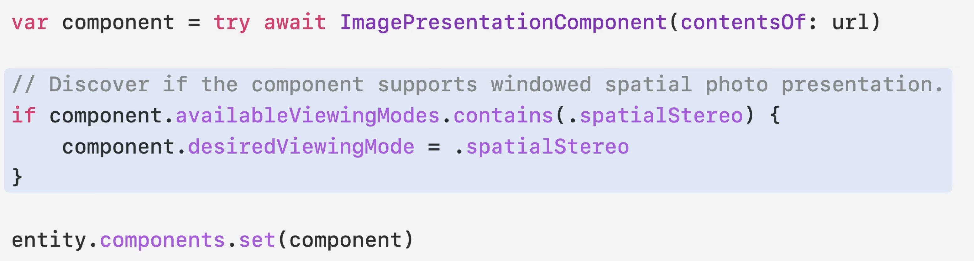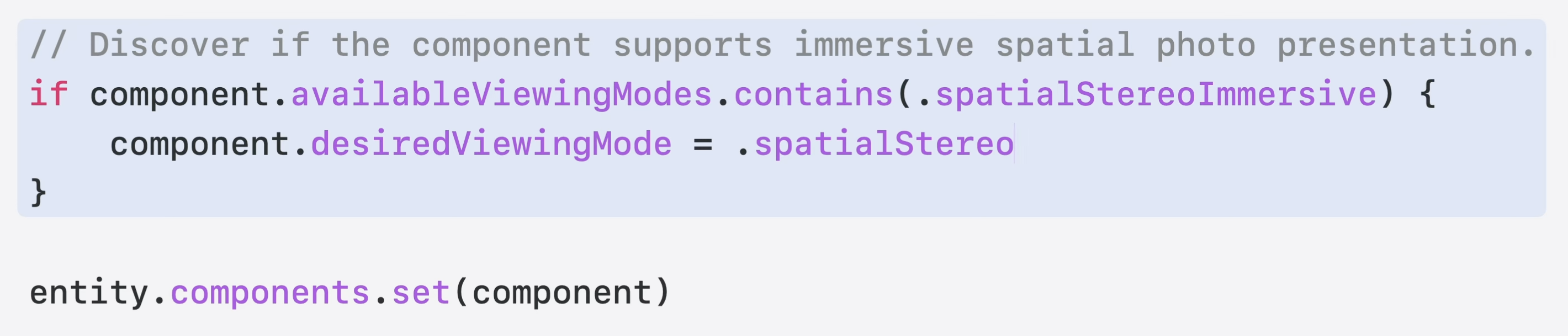 spatial photo를 표현하려면 한 가지 단계가 더 필요한데, 엔터티에 구성 요소를 설정하기 전에 해당 component에 대해 원하는 viewing mode를 지정해야 한다.