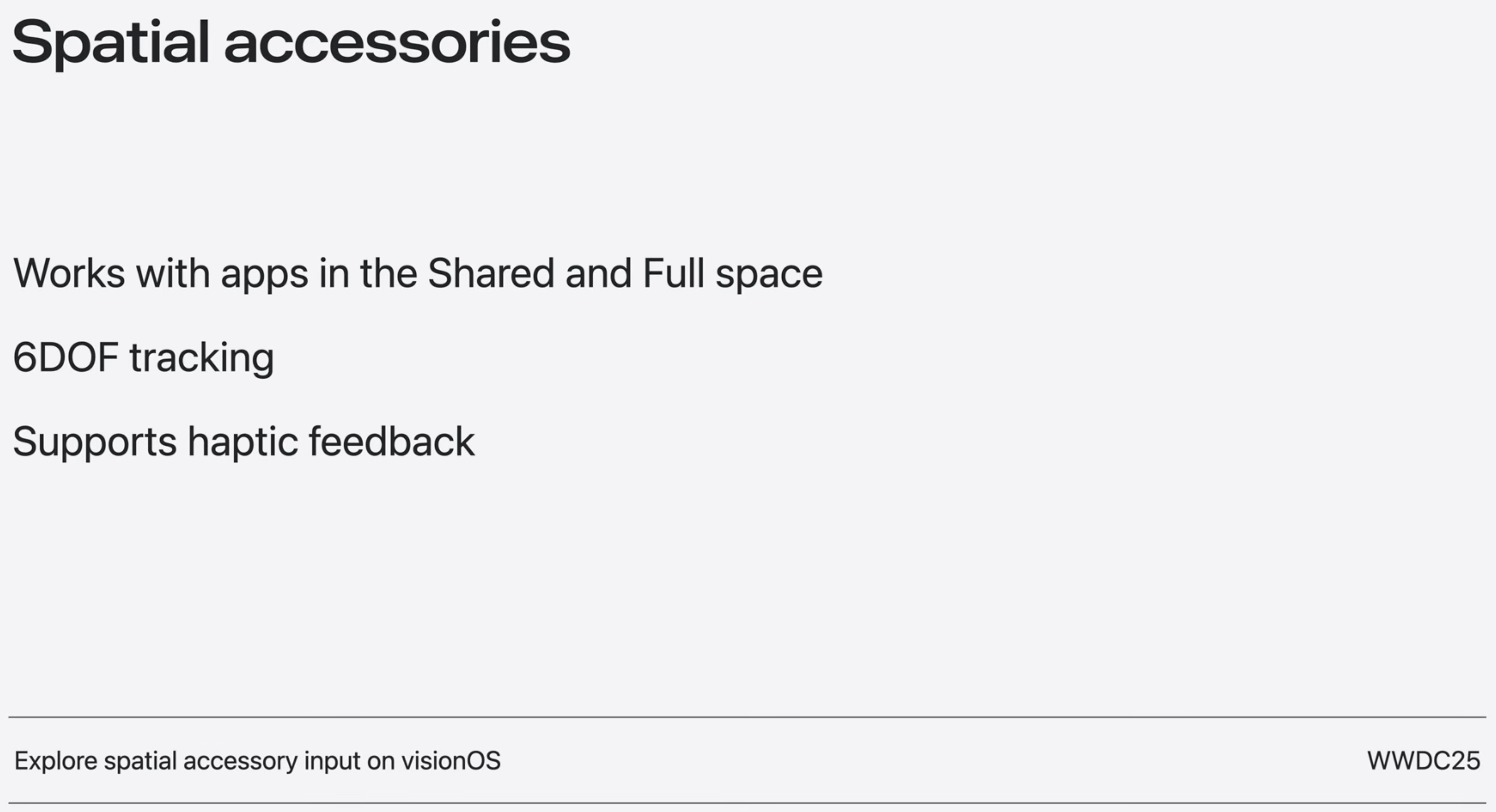 RealityKit은 shared space와 full space 모두에서 앱과 상호 작용할 수 있는 공간 액서서리에 대한 추적을 추가적으로 지원한다. 6 자유도로 공간 액세서리를 tracking 할 수 있으며, 앱과 게임의 상호 작용을 강화하는 햅틱 기능도 지원한다.