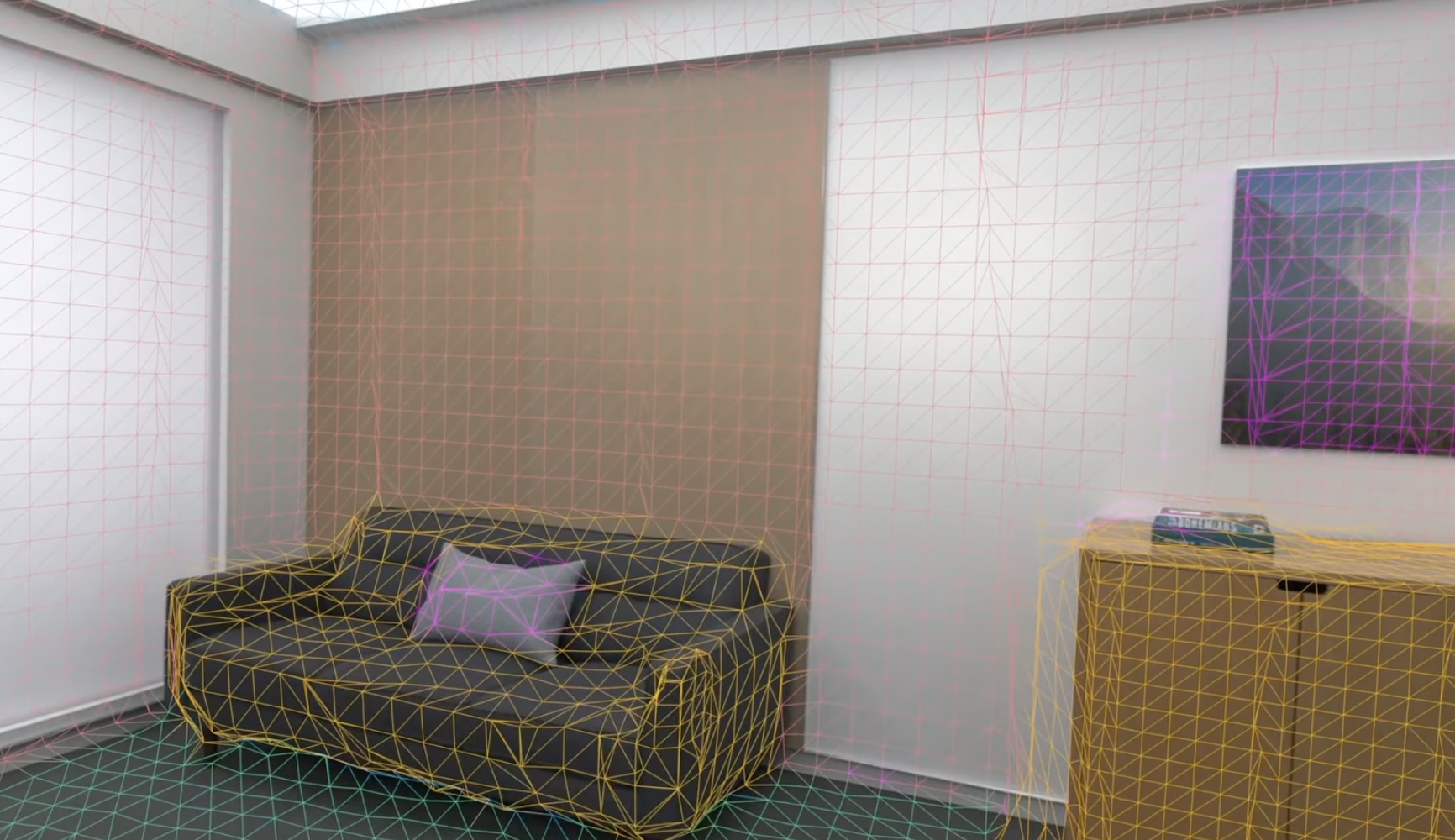 객체가 주변 환경과 충돌하도록 만들어보자. 새로운 Scene Understanding API를 사용하면 앱의 물리 시뮬레이션에 내 방의 mesh를 추가할 수 있다. RealityKit은 SpatialTrackingSession API를 통해 주변 환경의 메시를 생성할 수 있다. 이 메시는 Scene Understanding 메시라고 불리며 방 안의 실제 물체에 충돌과 물리 효과를 추가하는데 사용될 수 있다.