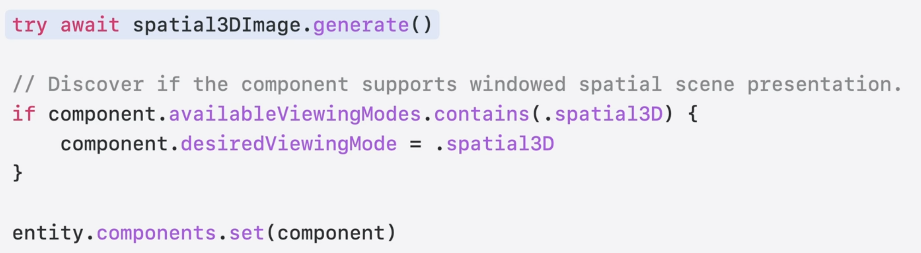 이를 위해 spatial 3D image의 generate method를 호출한다. 이렇게 하면 몇 초 안에 spatial scene이 생성된다. 성공적으로 생성된 후에는 ImagePresentationComponent의 availableViewingModes가 업데이트되어서 spatial3D 및 spatial3DImmersive 모드가 포함된다. 그런 다음 원하는 viewing mode를 선택하여 spatial scene을 window 모드로 표시하거나 immersive로 표시할 수 있다.