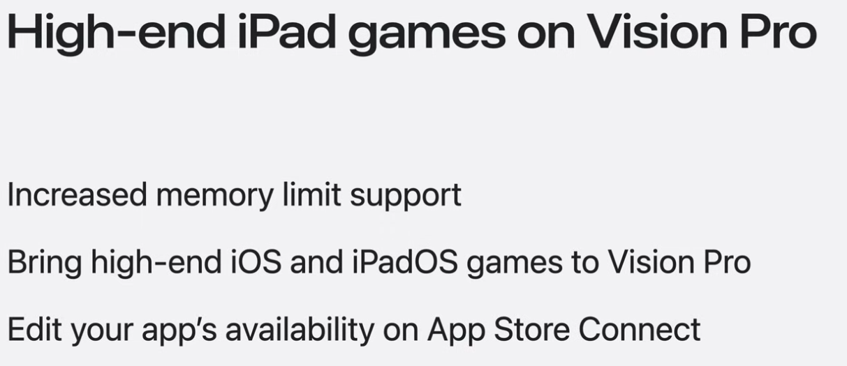 visionOS에서 메모리 한도 지원이 새롭게 확대되면서 App Store Connect를 사용하여 하이엔드 iPad 게임을 Vision Pro로 가져올 수 있다.