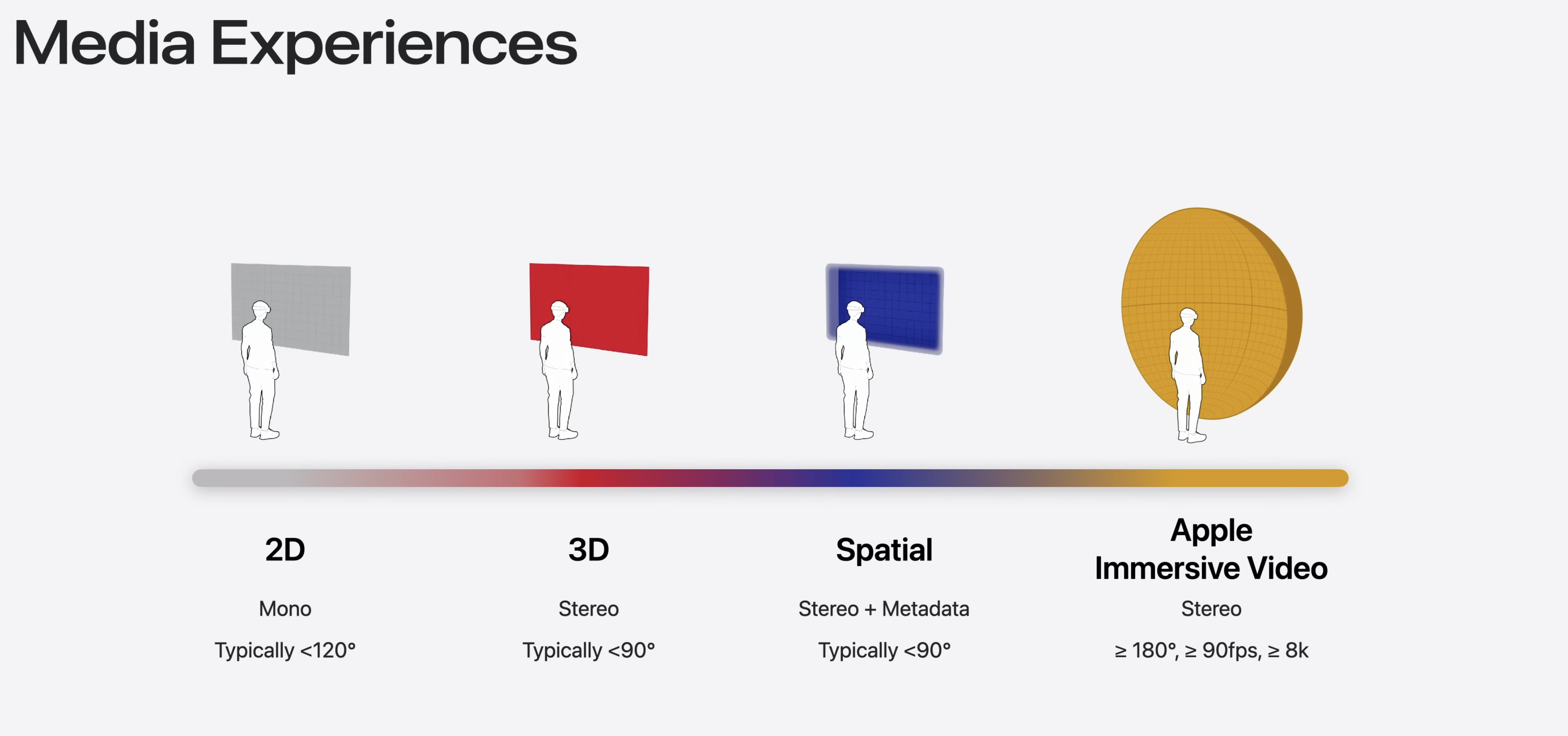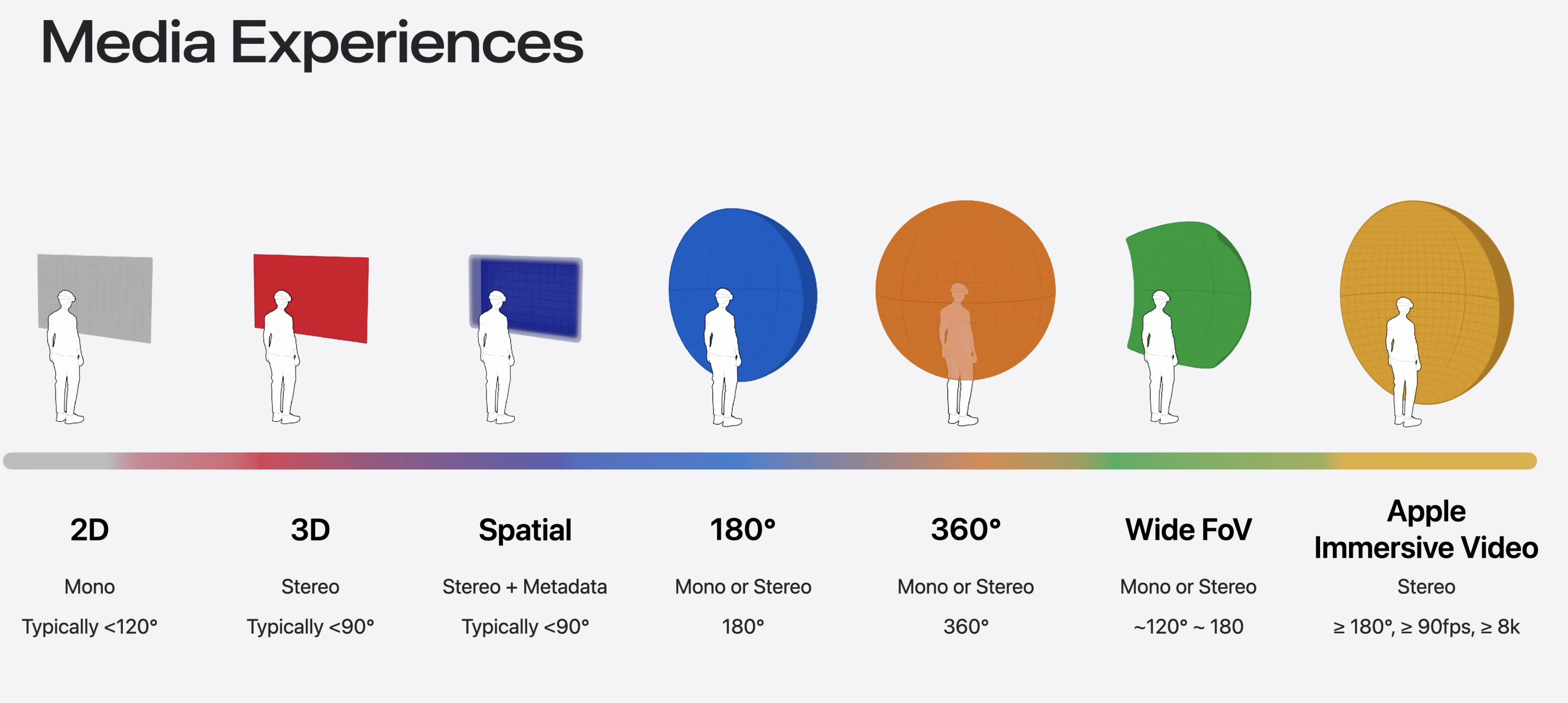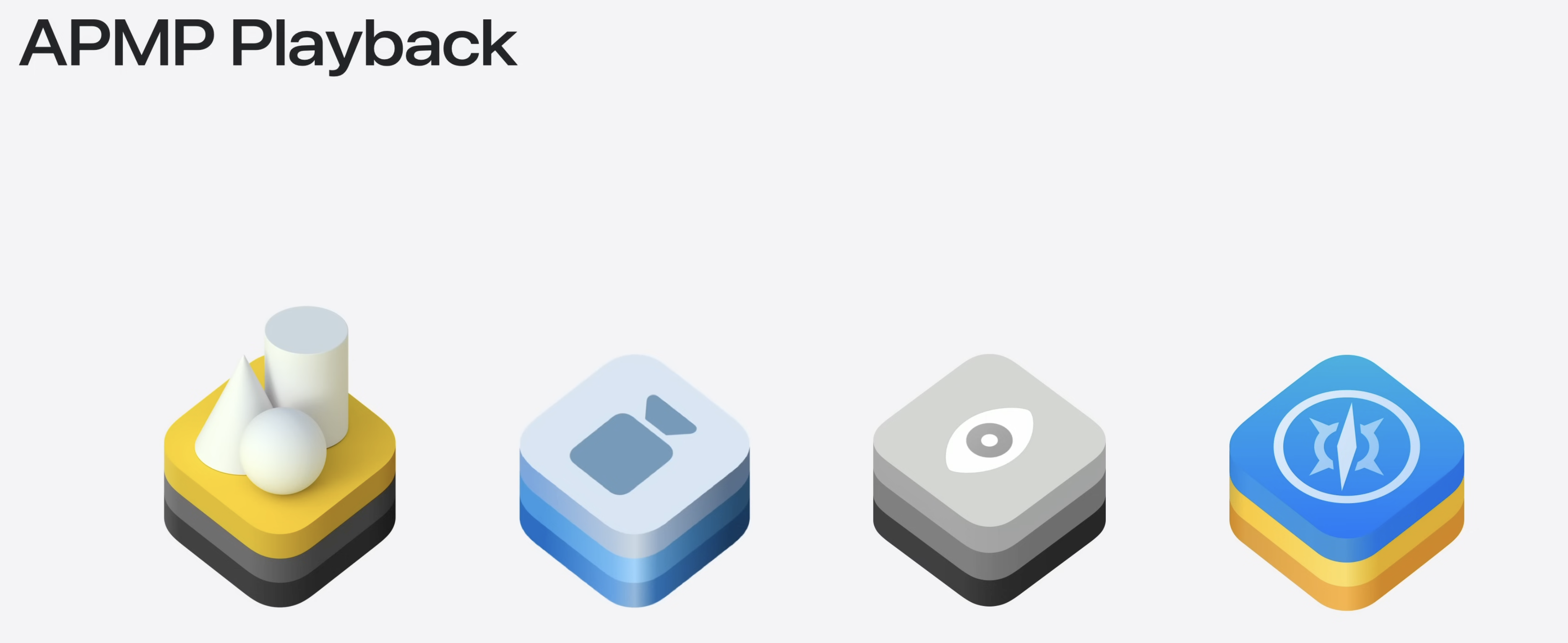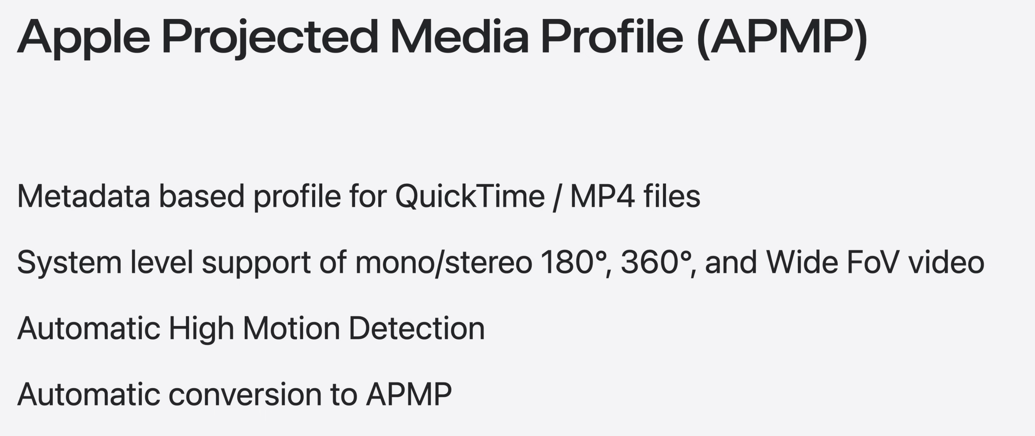 Apple Projected Media Profile(APMP) 덕분에 업계 최고 수준의 지원이 가능해졋다. 이를 통해 시청자에게 이상적인 프레젠테이션을 위해 projection(투영)이라고 하는 픽셀당 추가 기하학적 연산을 표현하는 유연한 방식을 제공한다.