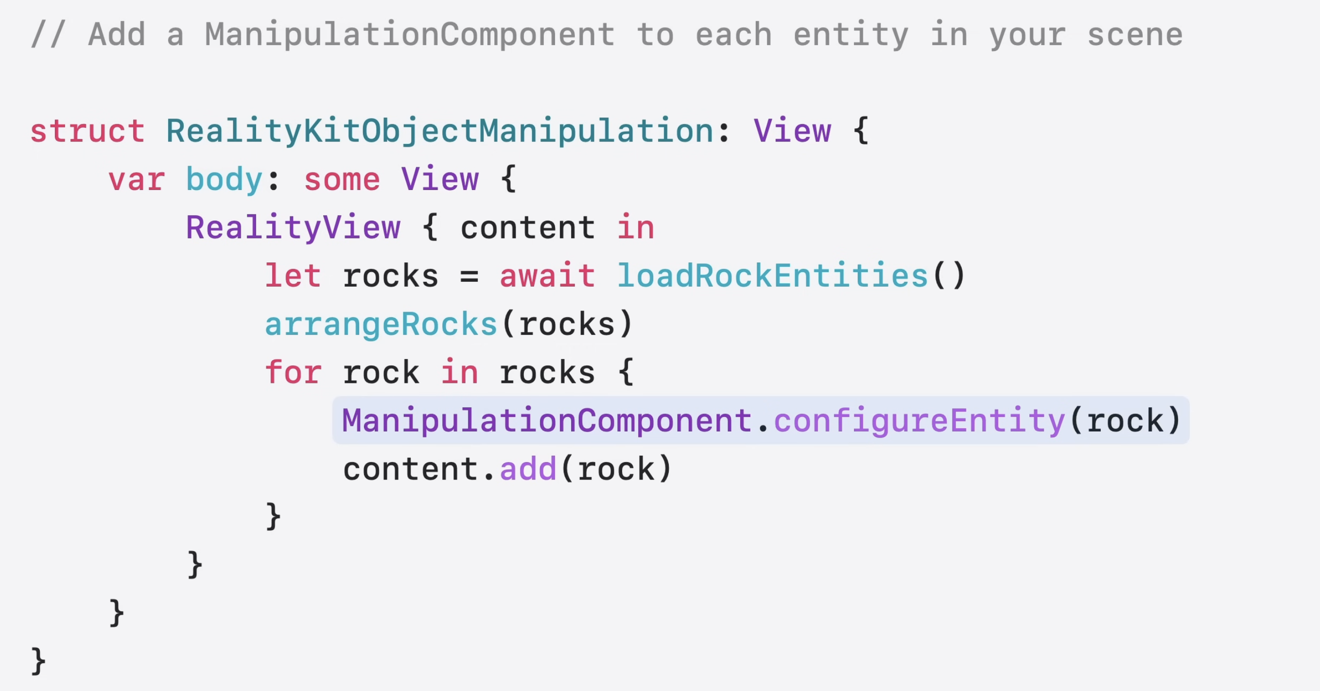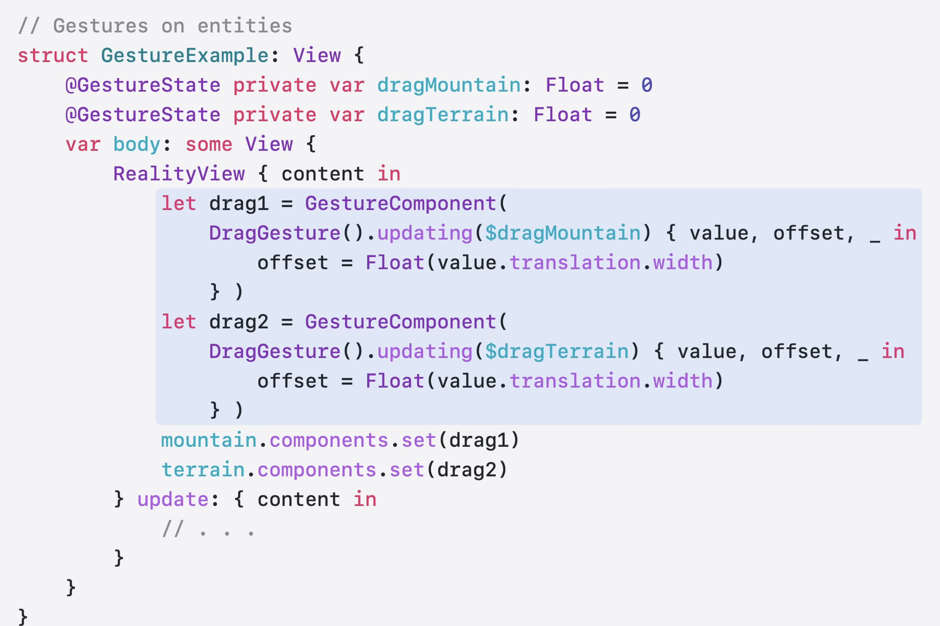 RealityView를 중개자로 사용하지 않고도 제스처를 RealityKit entity에 직접 첨부할 수 있다. SwiftUI 제스처를 엔터티에 직접 사용하면 플랫폼과 프레임워크 전반에 걸ㄹ쳐 제스처 처리를 더욱 통합하는 보다 일관되고 powerful한 API surface가 생성된다.