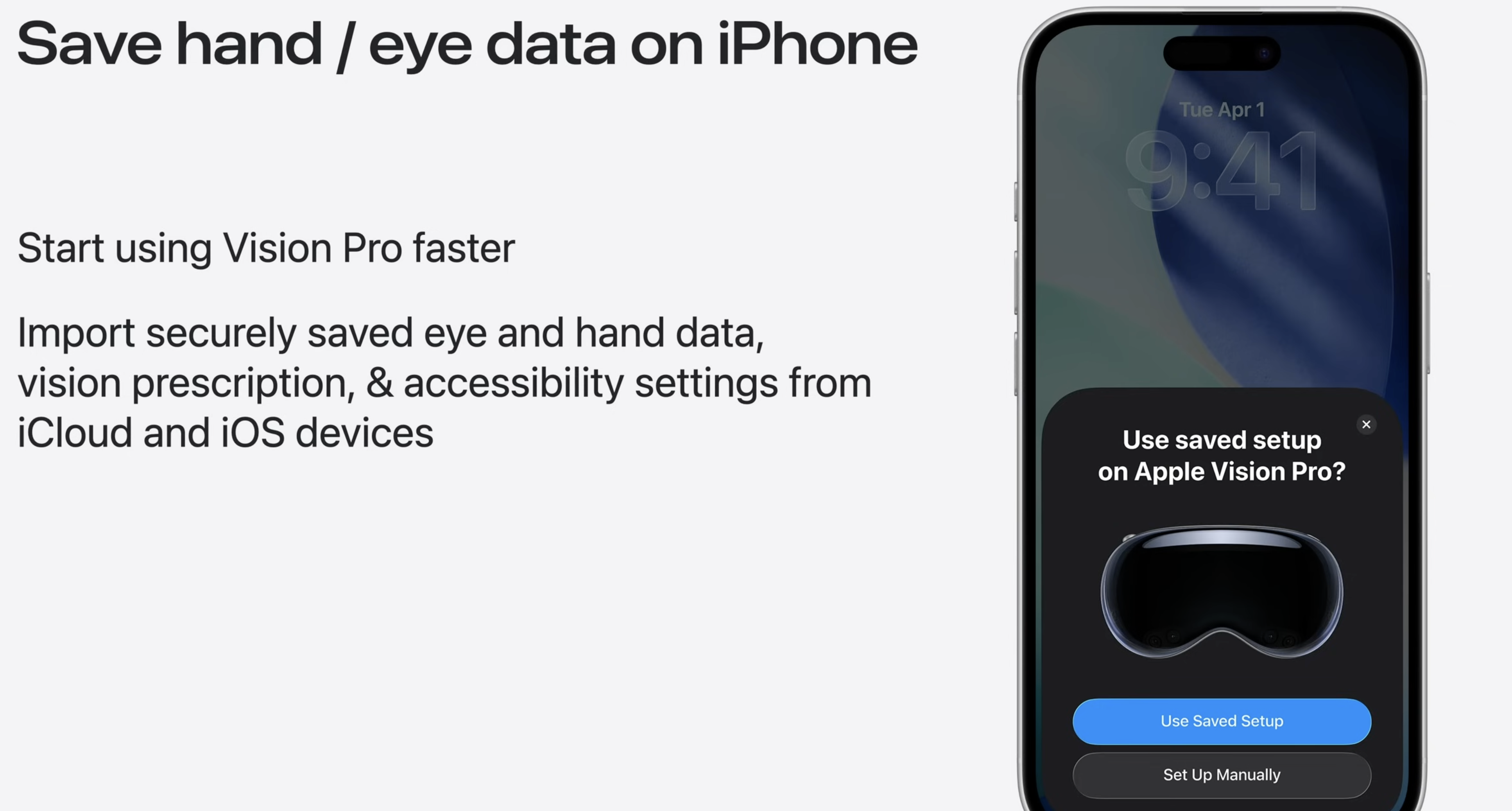 QuickStart 기능 향상으로 이제 사용자는 iCloud나 iOS 기기에 저장된 비전프로 설정 데이터를 가져올 수 있어 손과 눈을 다시 등록할 필요가 없다.
