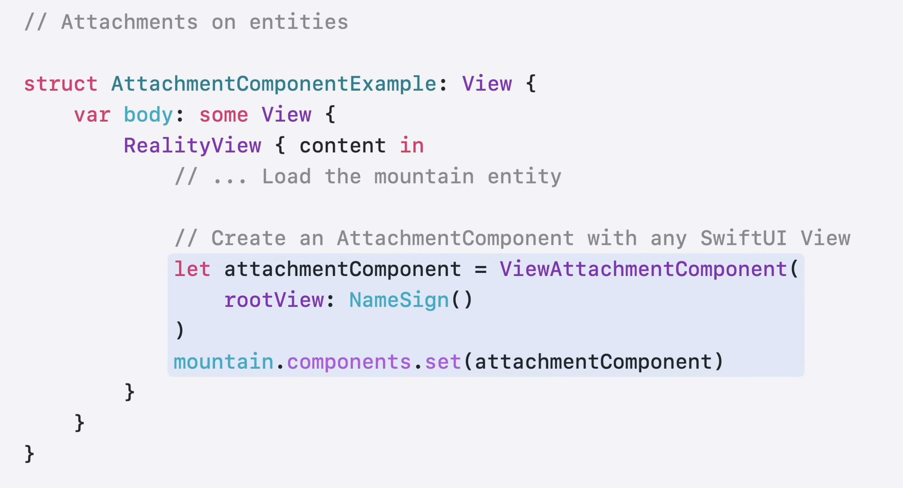visionOS 1에서는 SwiftUI View를 attachment를 통해 RealityKit 장면에 추가하곤 했다. 이제 ViewAttachmentComponent를 통해 RealityKit 코드의 나머지 부분과 함께 UI를 인라인으로 작성이 가능하다. 더 이상 attachment를 미리 만들 필요가 없고 원하는대로 장면에 구성 요소로 추가할 수 있다.