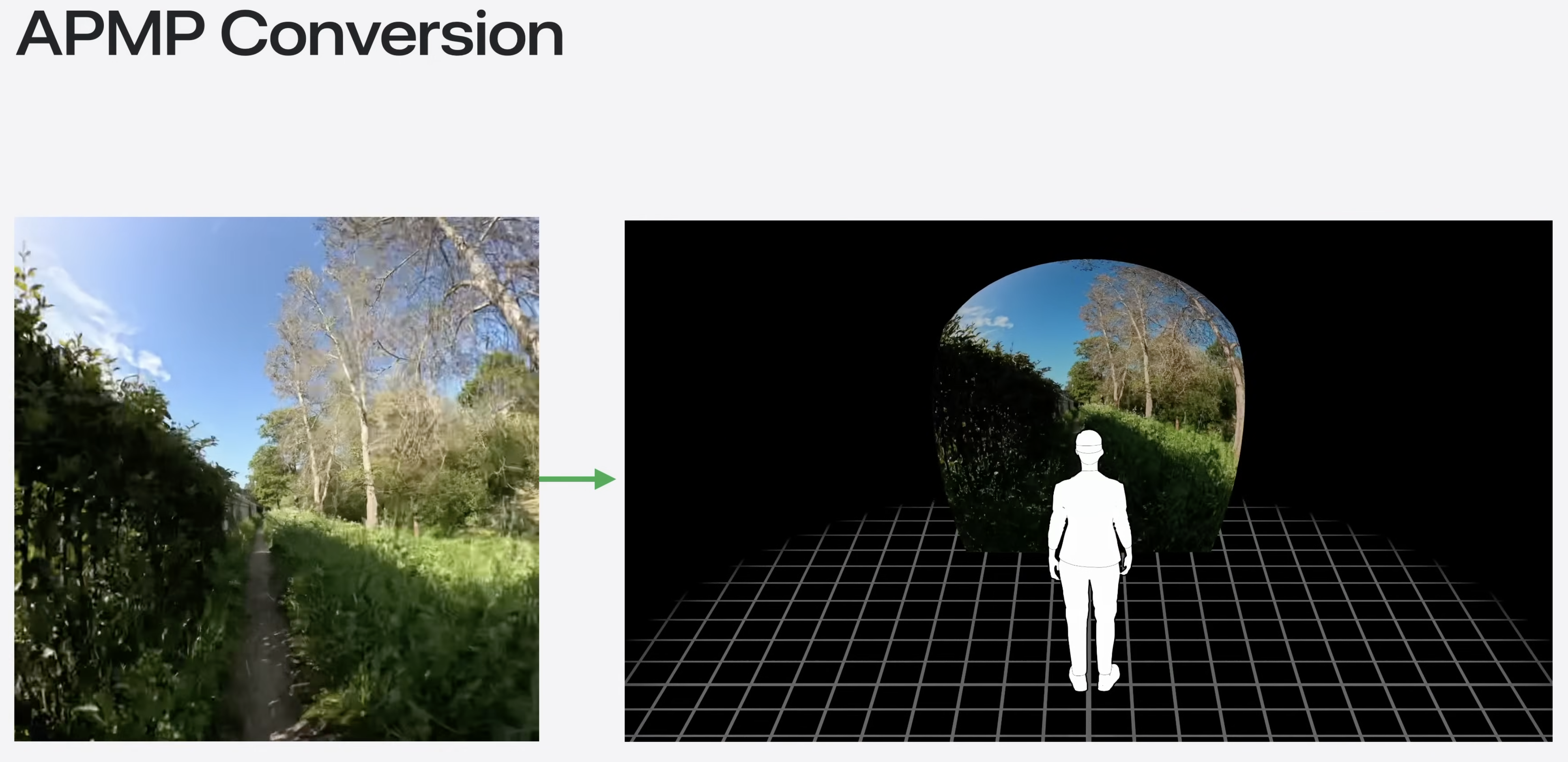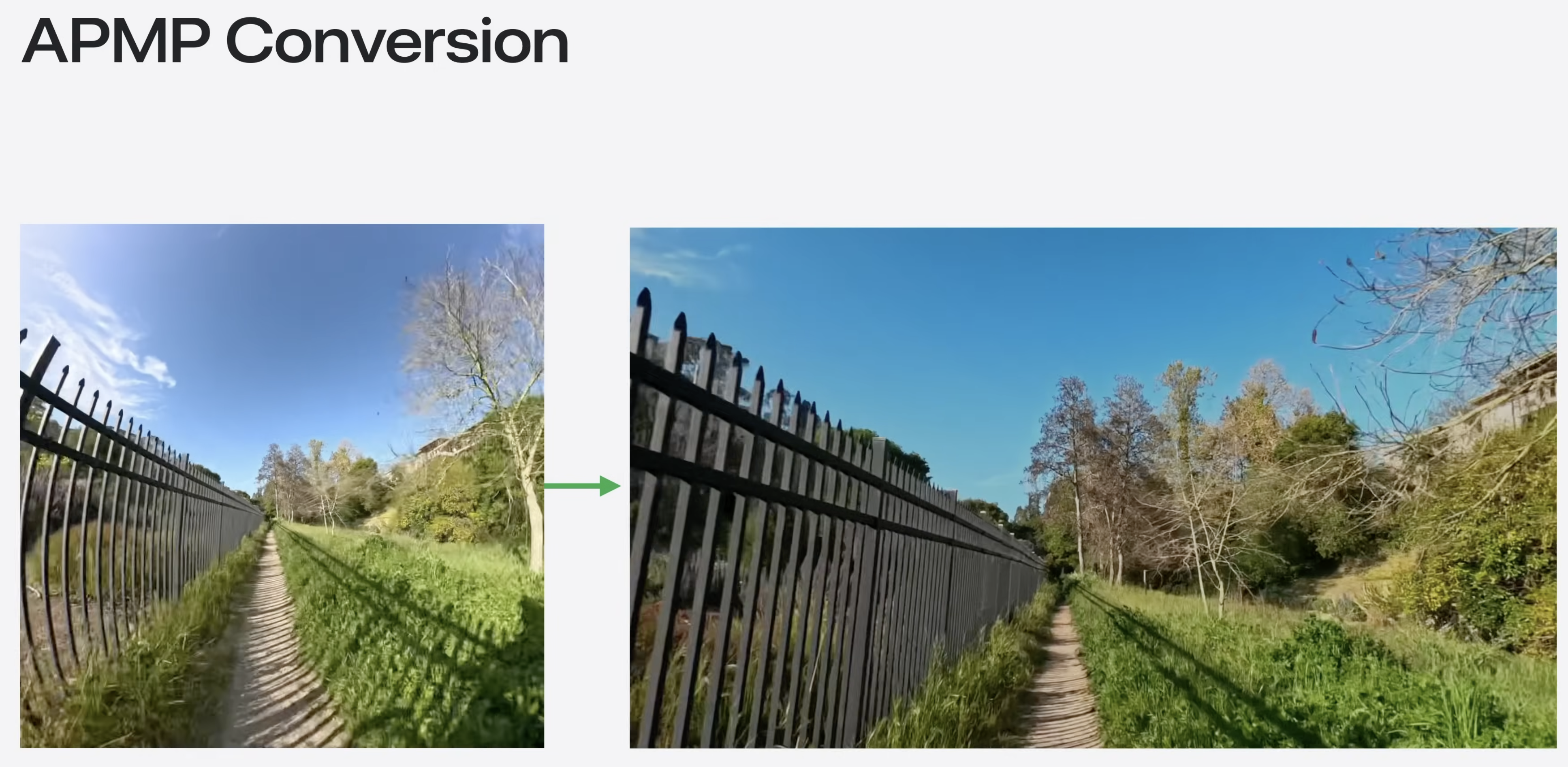 광각 어안 렌즈의 특성상 콘텐츠가 왜곡된 이미지로 기록된다. 원본 영상은 렌즈로 인해 배럴 왜곡이 발생한다. Apple Immersive Video에서 사용하는 접근 방식을 차용한 APMP를 사용하면 미디어 프레임워크에서 카메라 렌즈와 장치 캡처 모드로 정의된 곡면에 픽셀을 투사하여 렌즈 왜곡을 해제할 수 있다.