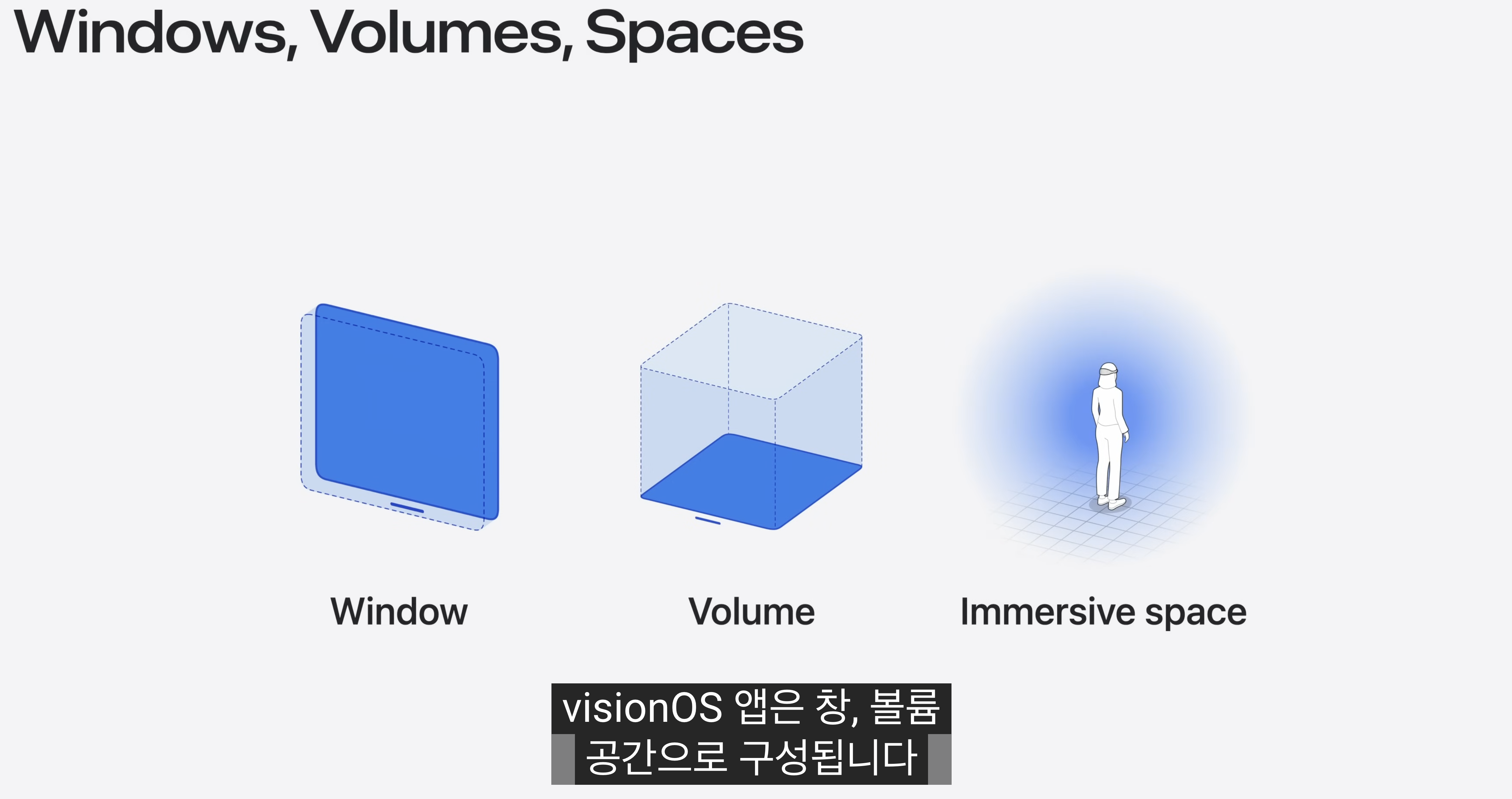 window와 volume은 앱의 UI와 콘텐츠를 제한하는 컨테이너 역할을 하며, shared space에서 콘텐츠를 표시하고 상호 작용할 수 있는 정의된 영역을 제공한다.