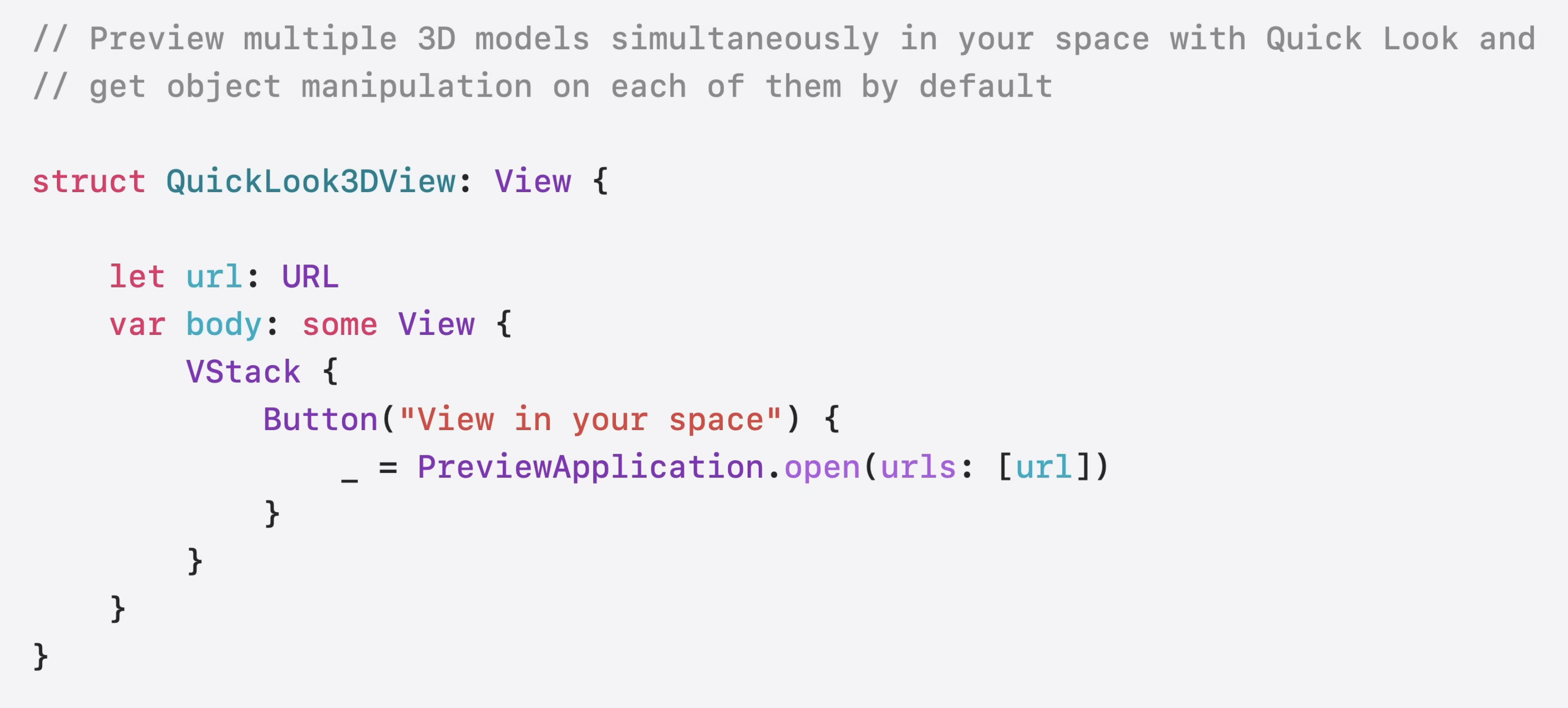 Quick Look을 사용하면 물리적인 객체와 마찬가지로 가상 객체를 조작하고, 크기를 조정하고, 서로에게 전달할 수 있다.