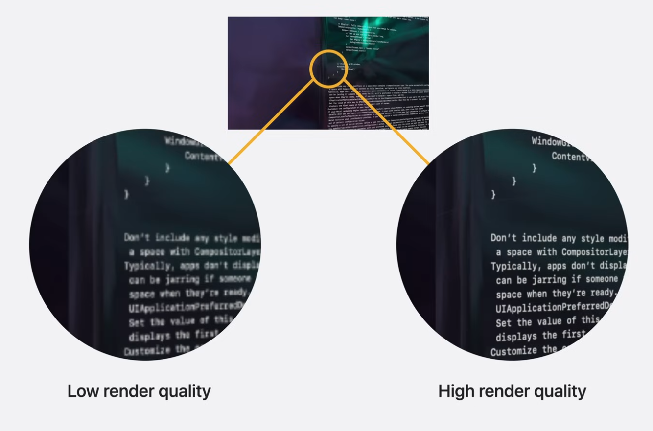앱의 랜더링 성능을 최적화하려면 세부적인 제어가 필요할 수 있으므로, Compositor Services에서 동적 렌더링 품질에 대한 지원을 추가하여 세부적인 장면이 돋보이게 표현되도록 했다.