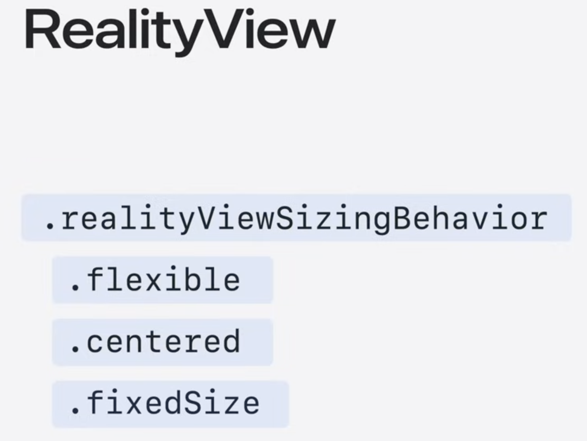 RealityView는 layout system과 원활하게 작동하며 realityViewSizingBehavior Modifier를 사용할 수 있다. 이를 통해 RealityView의 크기를 3D 콘텐츠에 맞춰 조정할 때 flexibility를 얻을 수 있다.