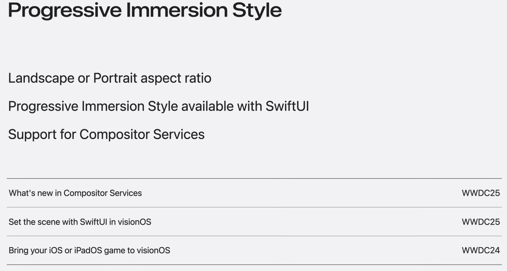 그리고 자체 Metal 랜더링 엔진을 visionOS에 도입하는 경우, progressive immersion style을 Compositor Services로 확장할 수 있다.