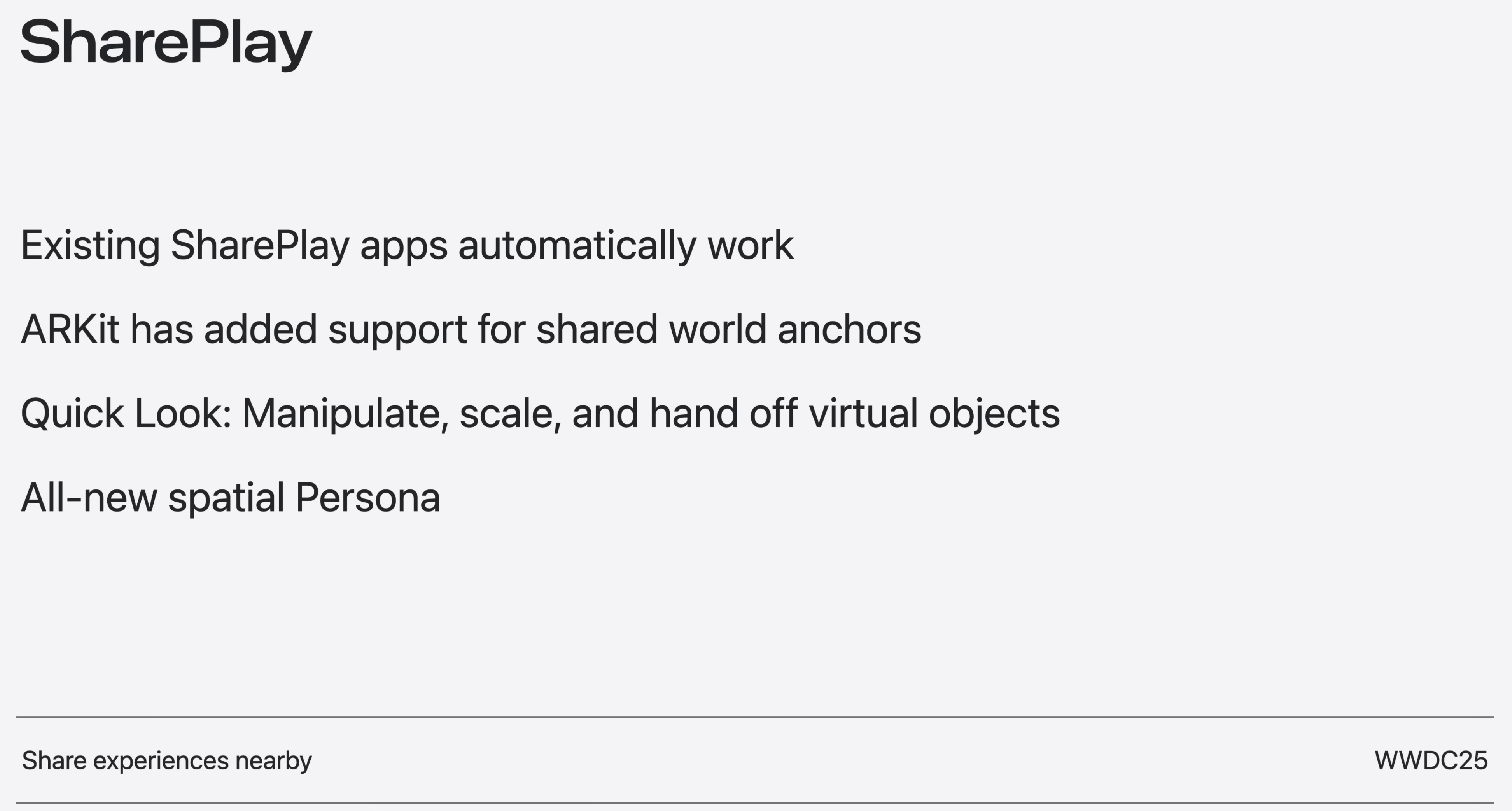 ARKit은 shared world anchor에 대한 지원을 추가하여 공유 콘텐츠를 방에 정확하게 고정할 수 있게 되었다. SharePlay 세션 중에 앱과 콘텐츠를 주변 환경에 맞게 이동, 크기 조절, 스냅할 수 있다.