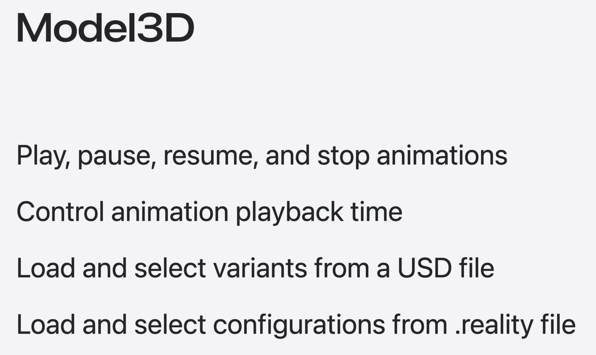 Model3D에서 이제 애니메이셔 재생, 정지 등이 가능해졌고 USD 파일에서 variants를 선택하고 .reality 파일에서 configuration을 로드하여 선택할 수 있다.
