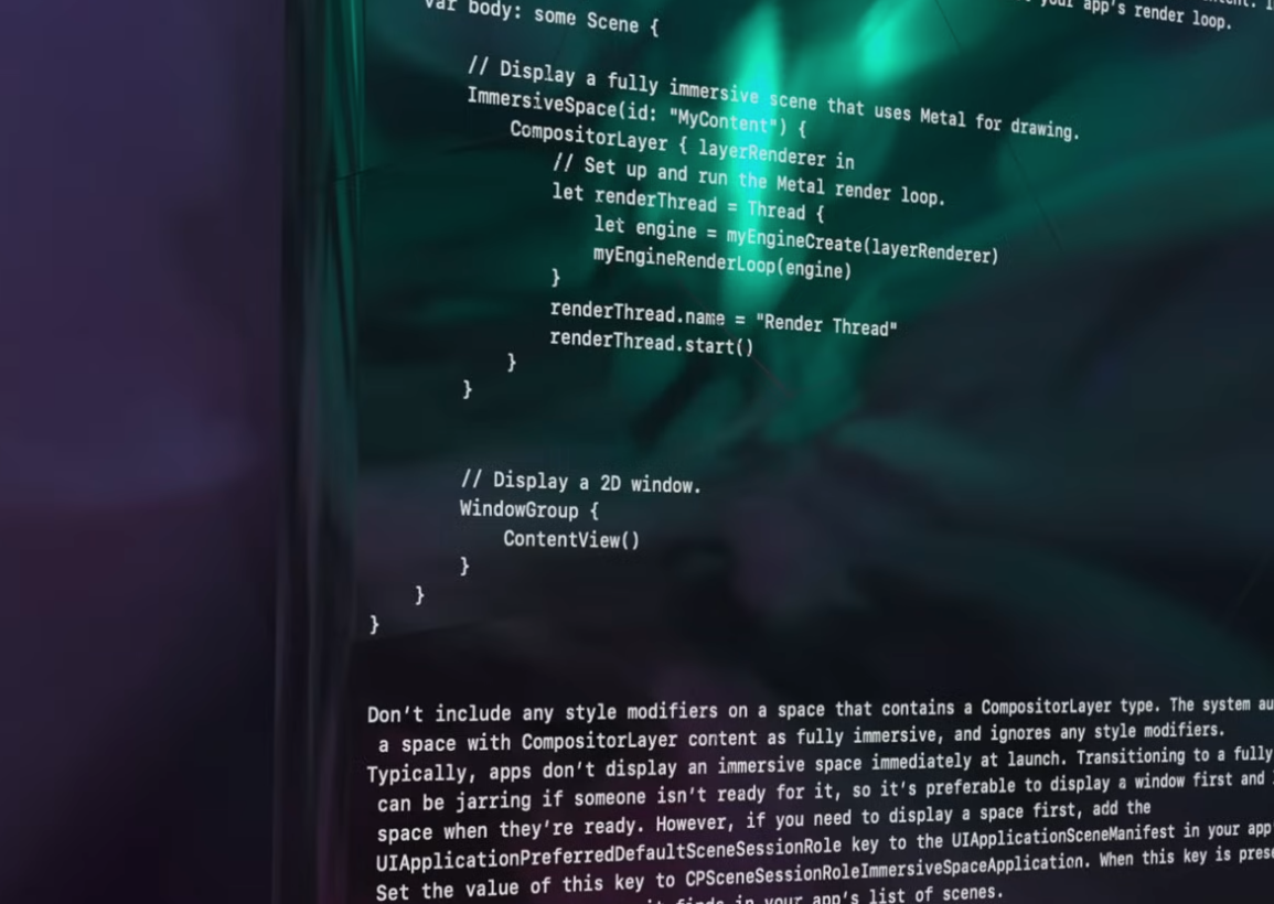 Compositor Services를 사용하면 자체 Metal 엔진을 visionOS에 적용하여 full, mixed, progressive style로 몰입형 공간에 랜더링 할 수 있다.