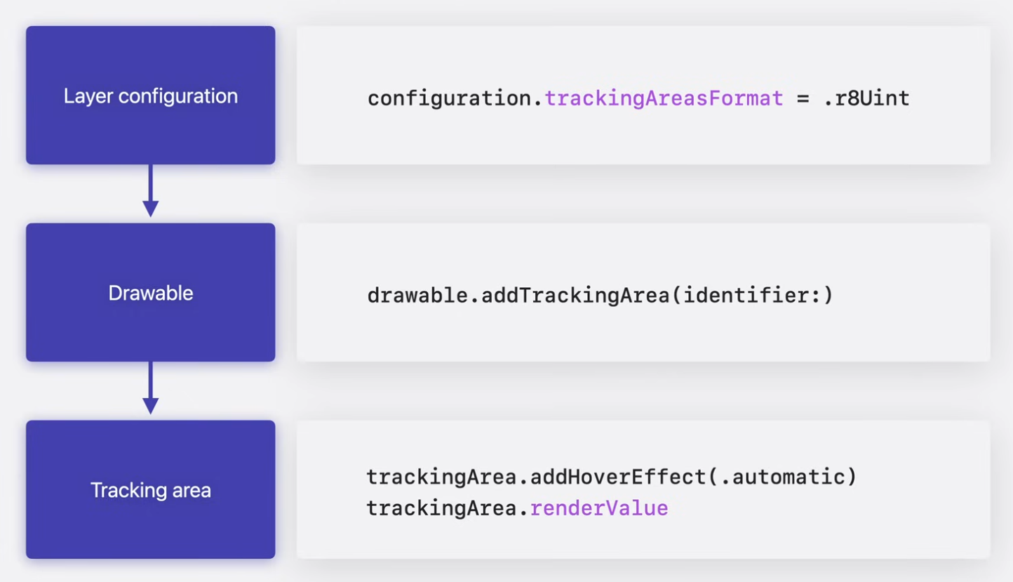 이 기능을 사용하려면 tracking area의 texture 형식을 구성하고 drawable에 tracking area를 추가한 다음 tracking area에 hover effect를 구성하고 렌더 값을 그려야 한다.