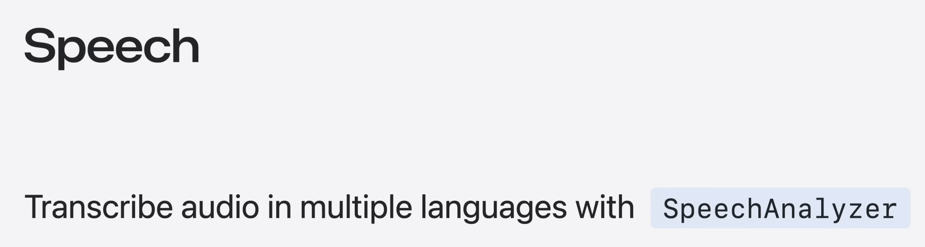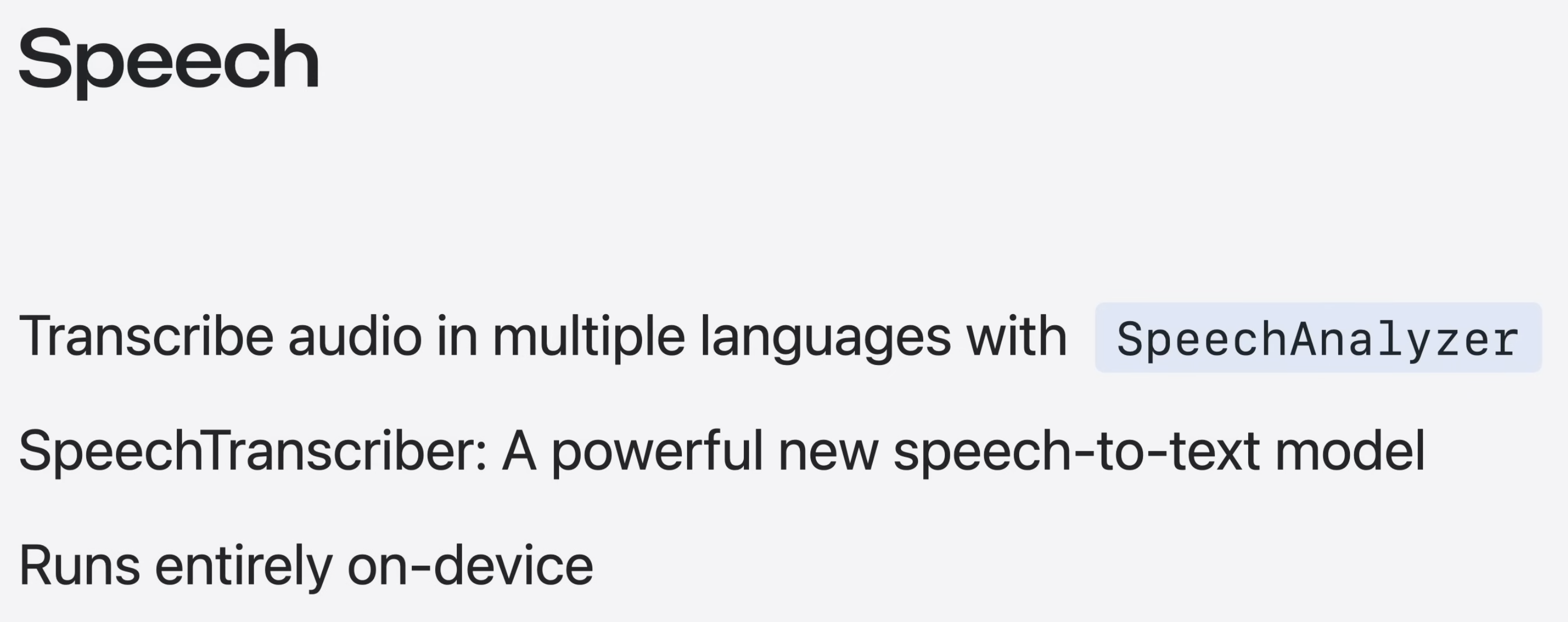 또한 새로은 음성-텍스트 모델인 SpeechTranscriber도 출시된.이전 새대보다 빠르고 유연해서 미디어 캡션 작성과 같은 까다로운 필사 작업에 이상적이다. SpeechAnalyzer는는 전적으로 기기에서 실행되므로 사용자의 데이터는 완벽하게 비공개로 유지된다.