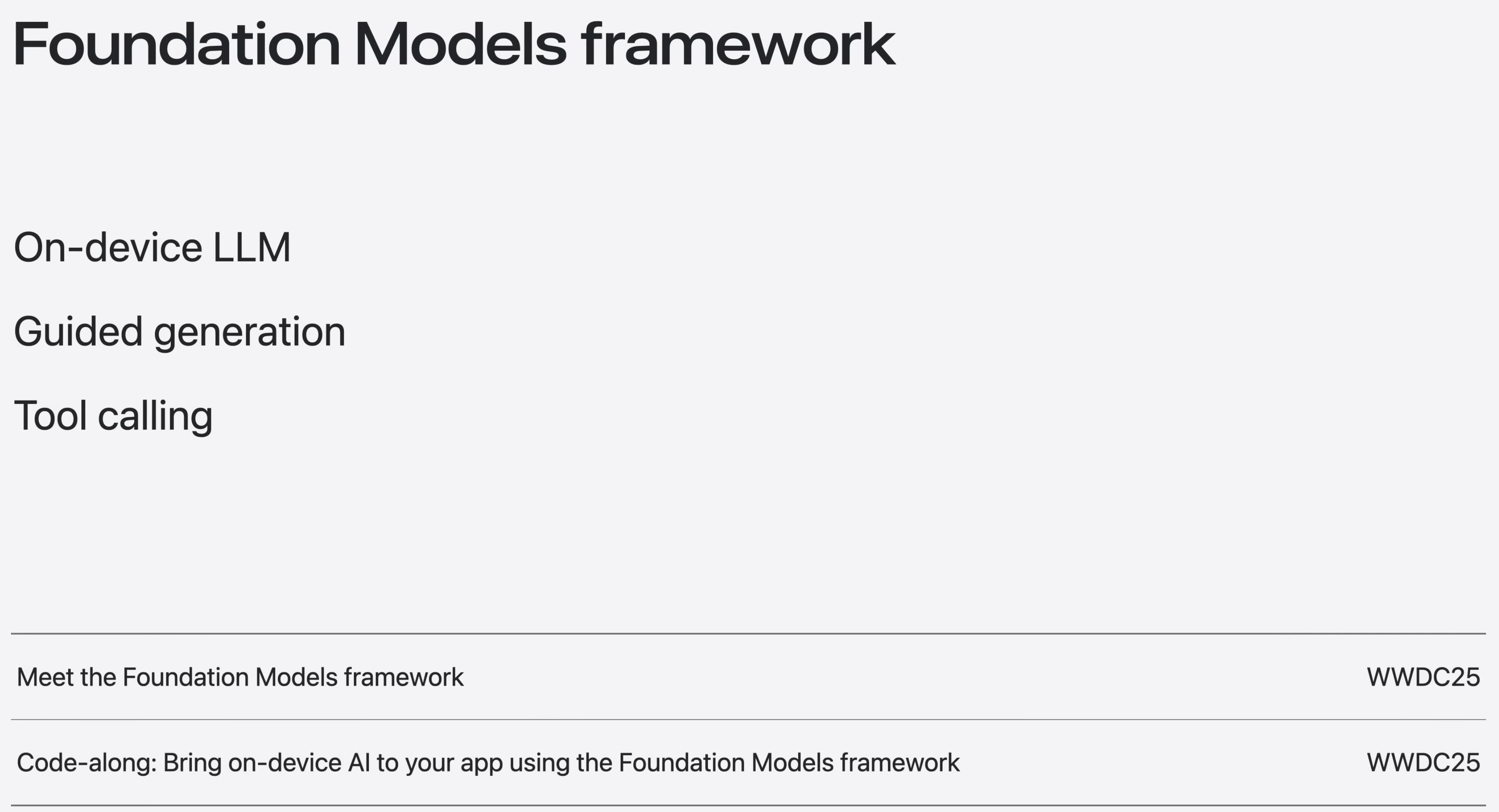 새로운 Foundation Model 프레임워크를 사용하면 많은 Apple Intelligence 기능의 핵심인 기기 내 LLM 모델에 접근 할 수 있다.