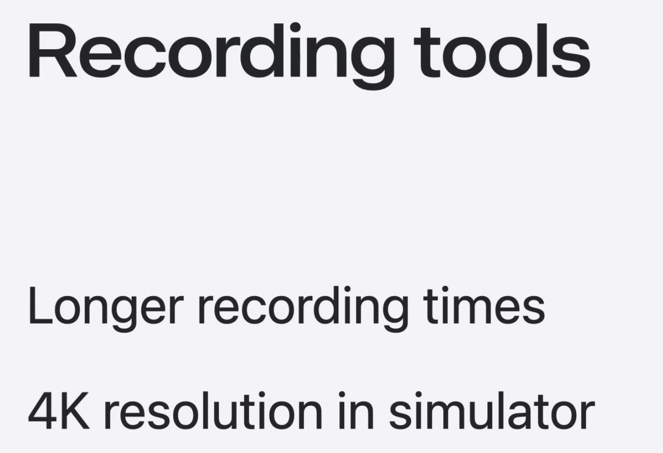 Vision Pro에서 콘텐츠를 녹화하는 경우 이제 Reality Composer Pro를 사용하여 세션당 3배 더 많은 콘텐츠를 캡처할 수 있다. 이제 시뮬레이터는 장치가 없어도 녹화할 수 있ㅇ르 뿐만 아니라 4K 해상도도 지원한다.