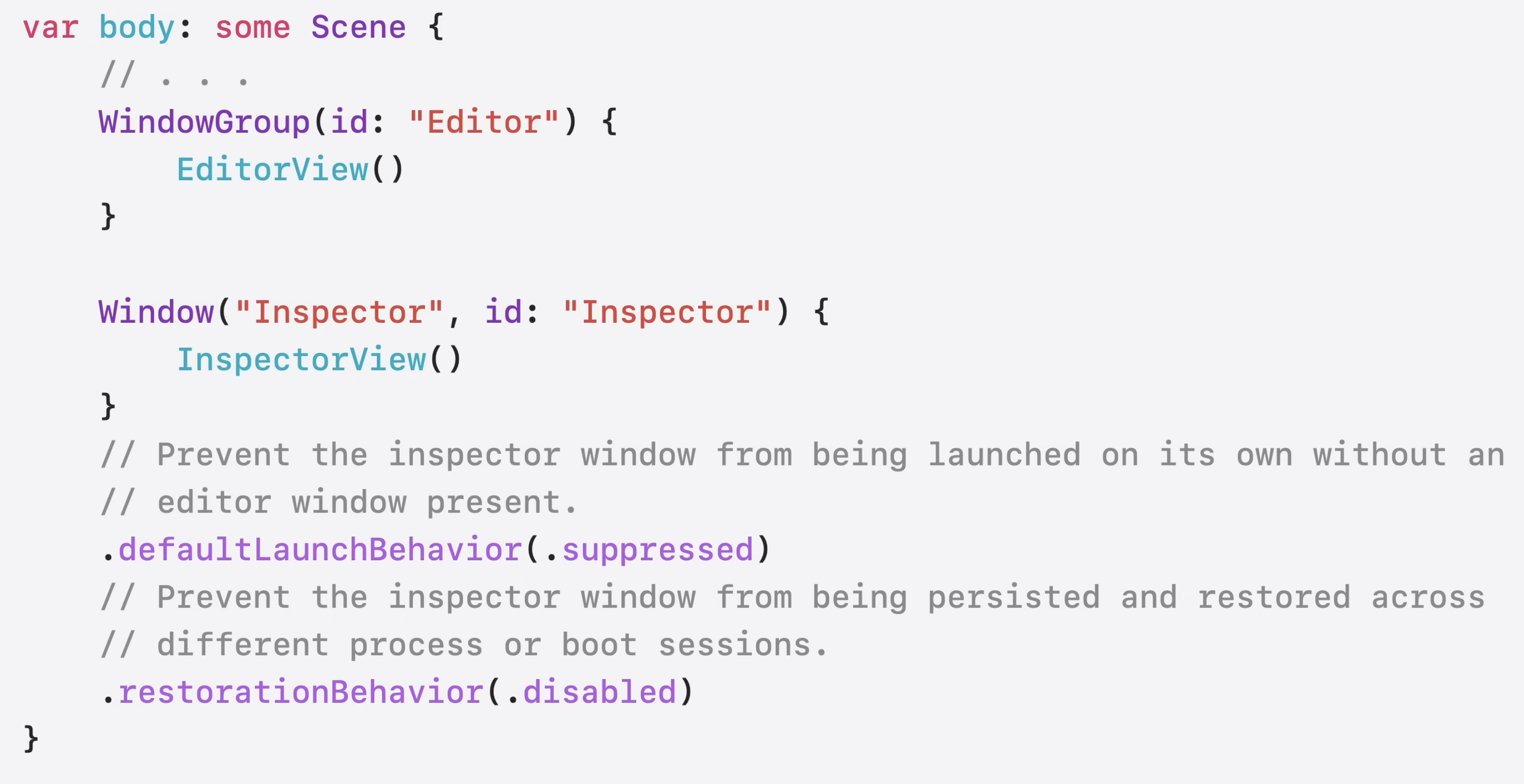 예를 들어, 앱에서 Inspector window 같은 window에 접근하면 이제는 시작 시에 생성을 억제 하고 복원을 비활성화 하도록 플래그를 지정할 수도 있다. 이러한 API와 새로운 snapping enironment property를 사용하면 앱을 공간에 맞춰 배치하고, 표면 유형에 따라 콘텐츠를 동적으로 변경하며 다음에 앱이 space에 방문할 때 적절한 window 세트를 제공할 수 있다.