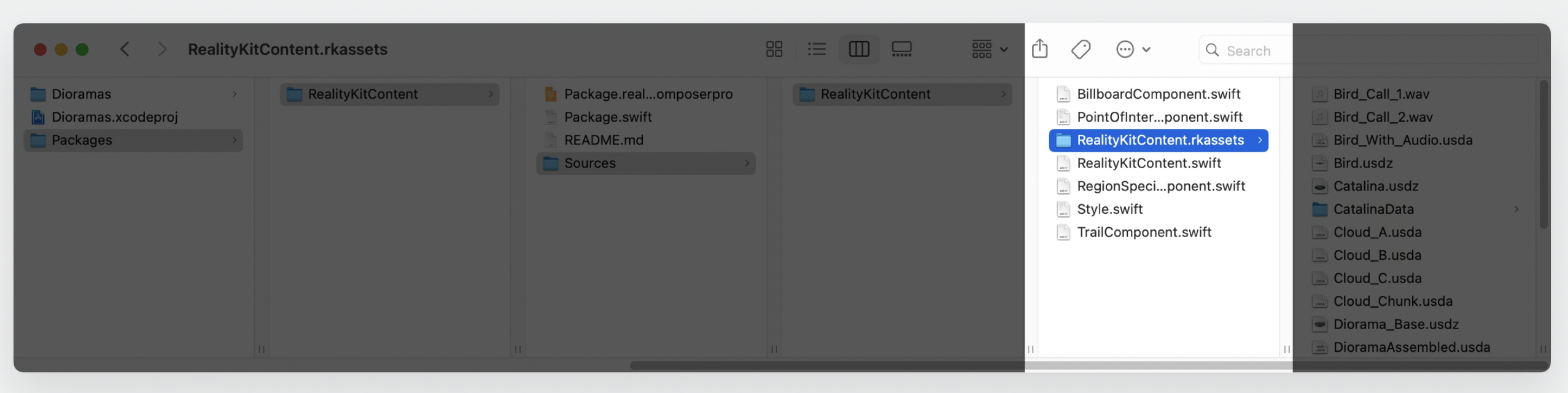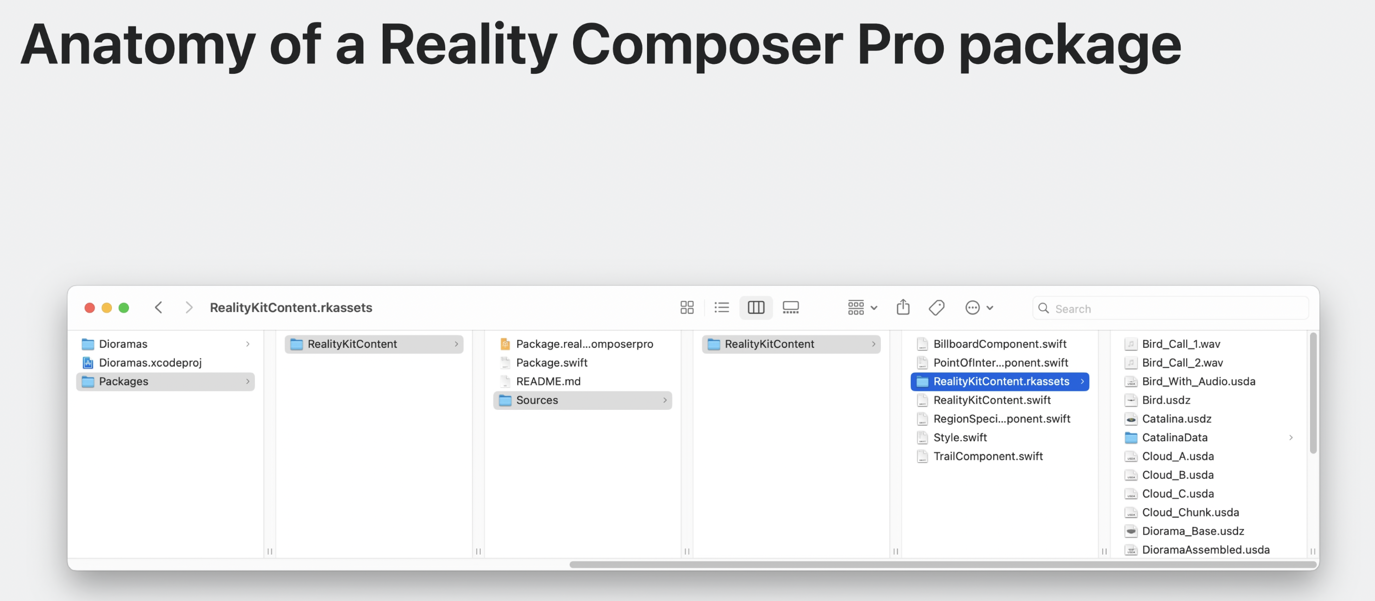Reality Composer Pro 프로젝트에 추가하지 않은 Xcode project에서 사용하는 USD 에셋이 있다면 이 asset들을 Swift Package에 .rkasset 디렉토리로 넣기를 강력히 권고한다.