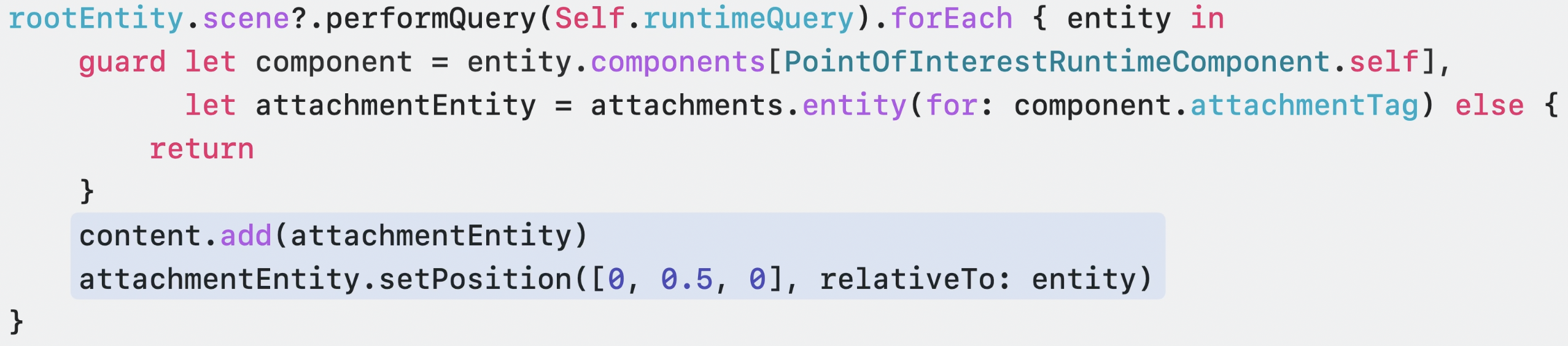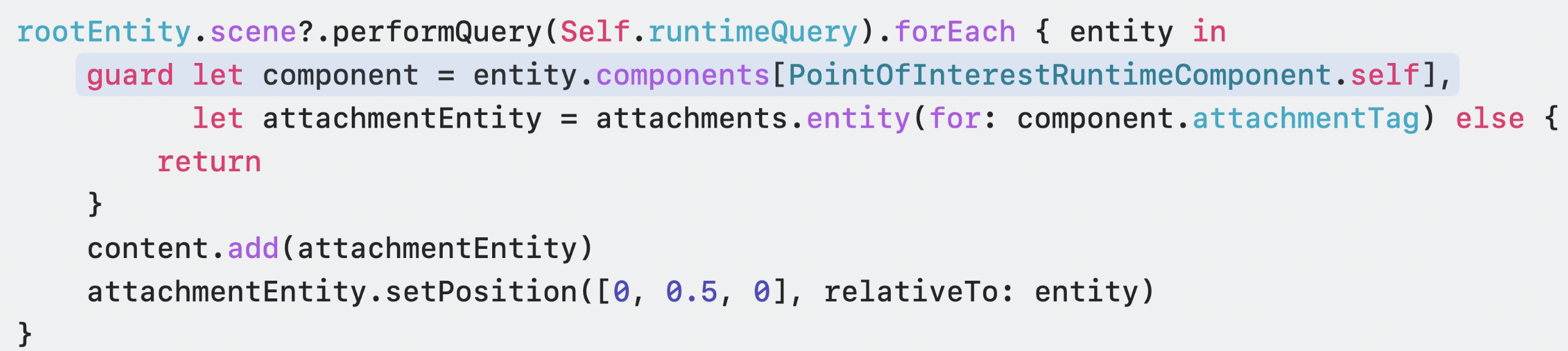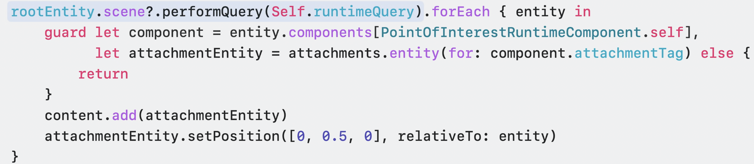 코드에서는 query를 통해 이 entity들에 대한 참조 값을 얻어낸다. query들은 Reality Composer Pro에서 설정한 세가지의 보이지 않는 Entity들에 대해 반환할 것이다.