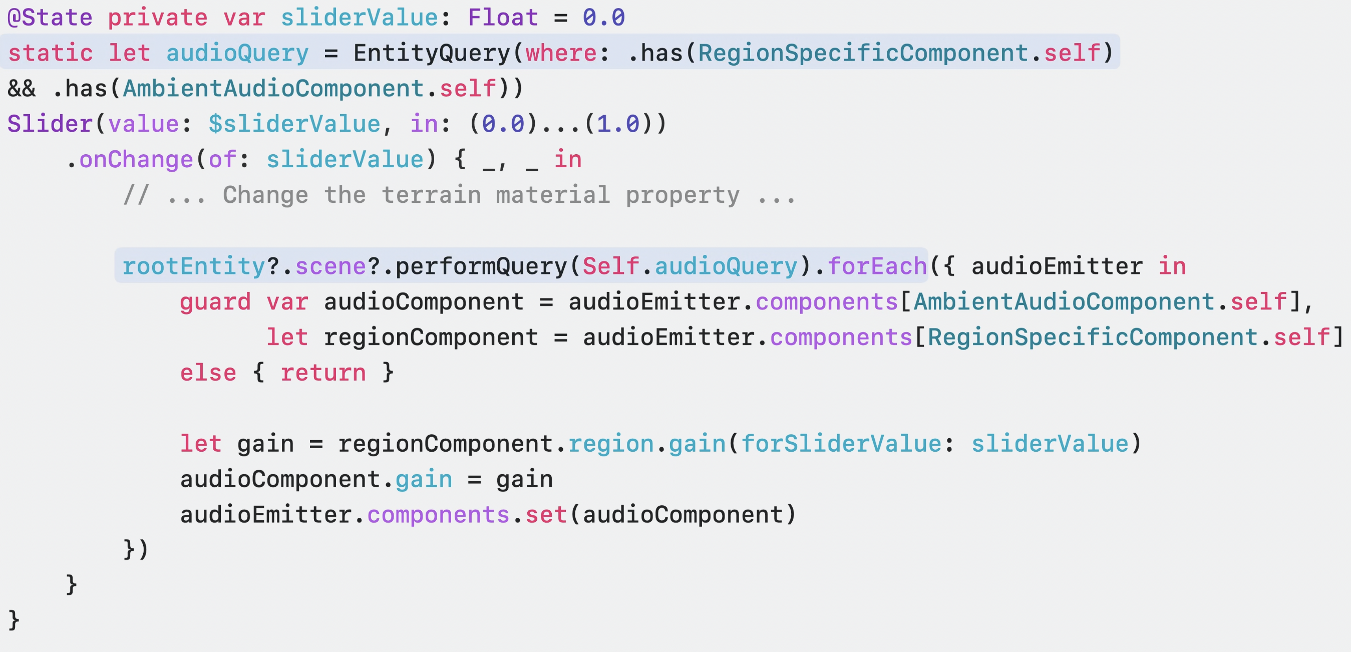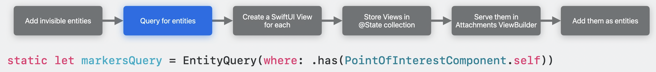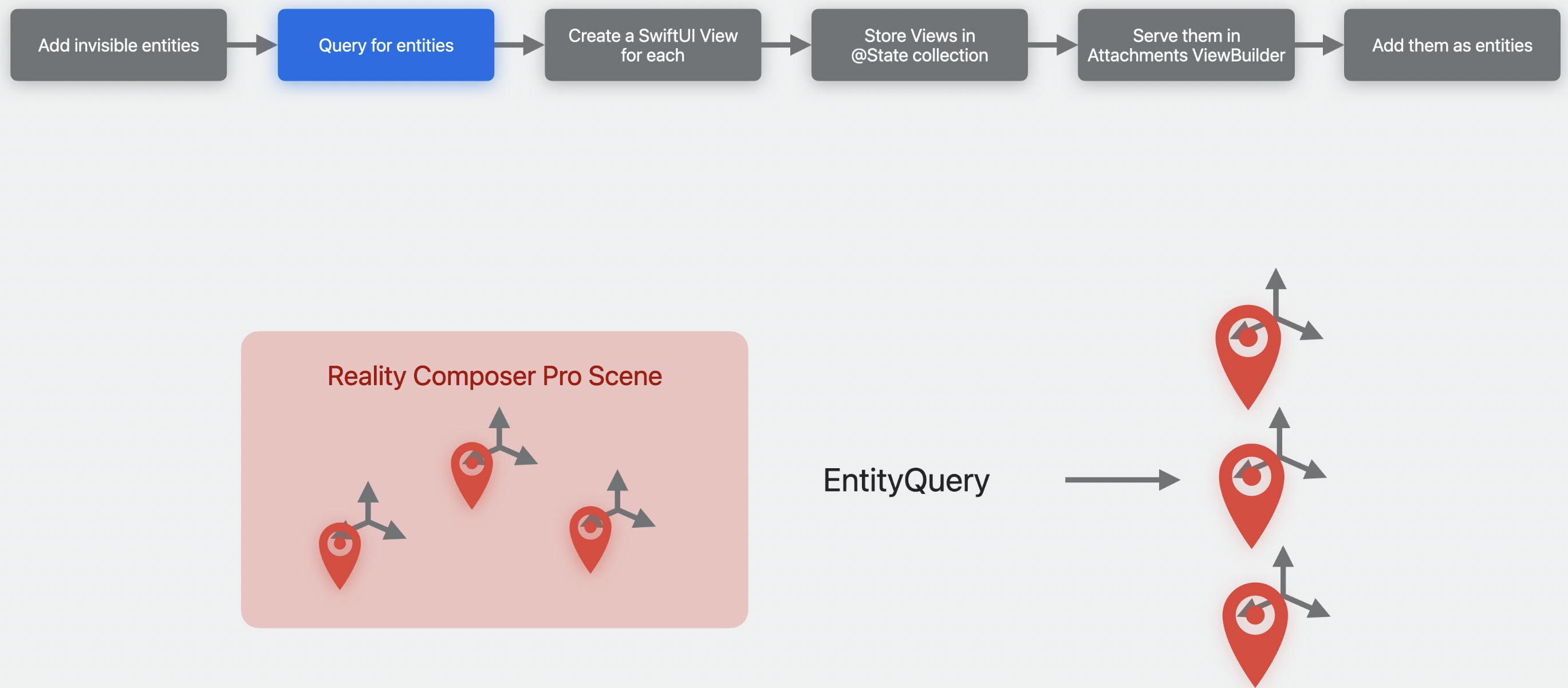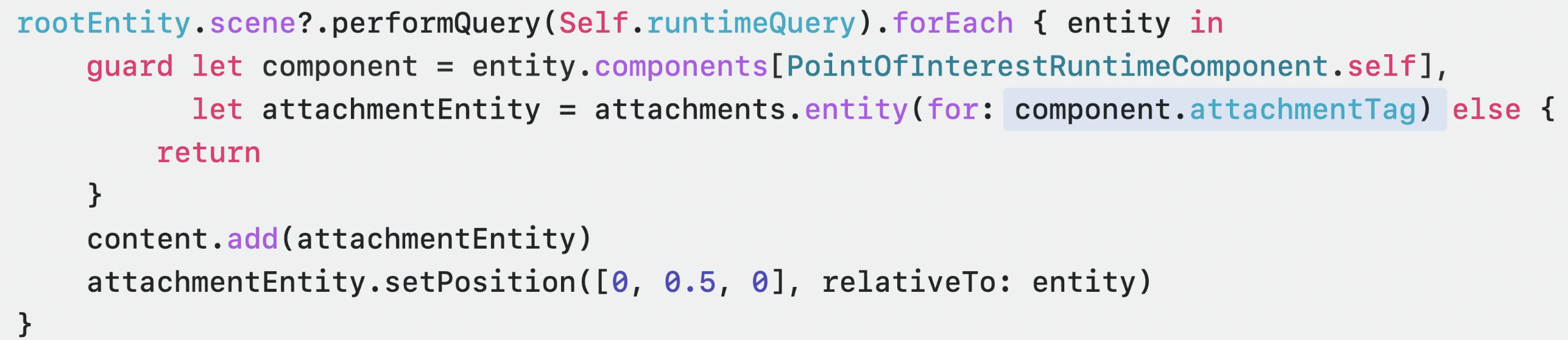 코드에서는 query를 통해 이 entity들에 대한 참조 값을 얻어낸다. query들은 Reality Composer Pro에서 설정한 세가지의 보이지 않는 Entity들에 대해 반환할 것이다.