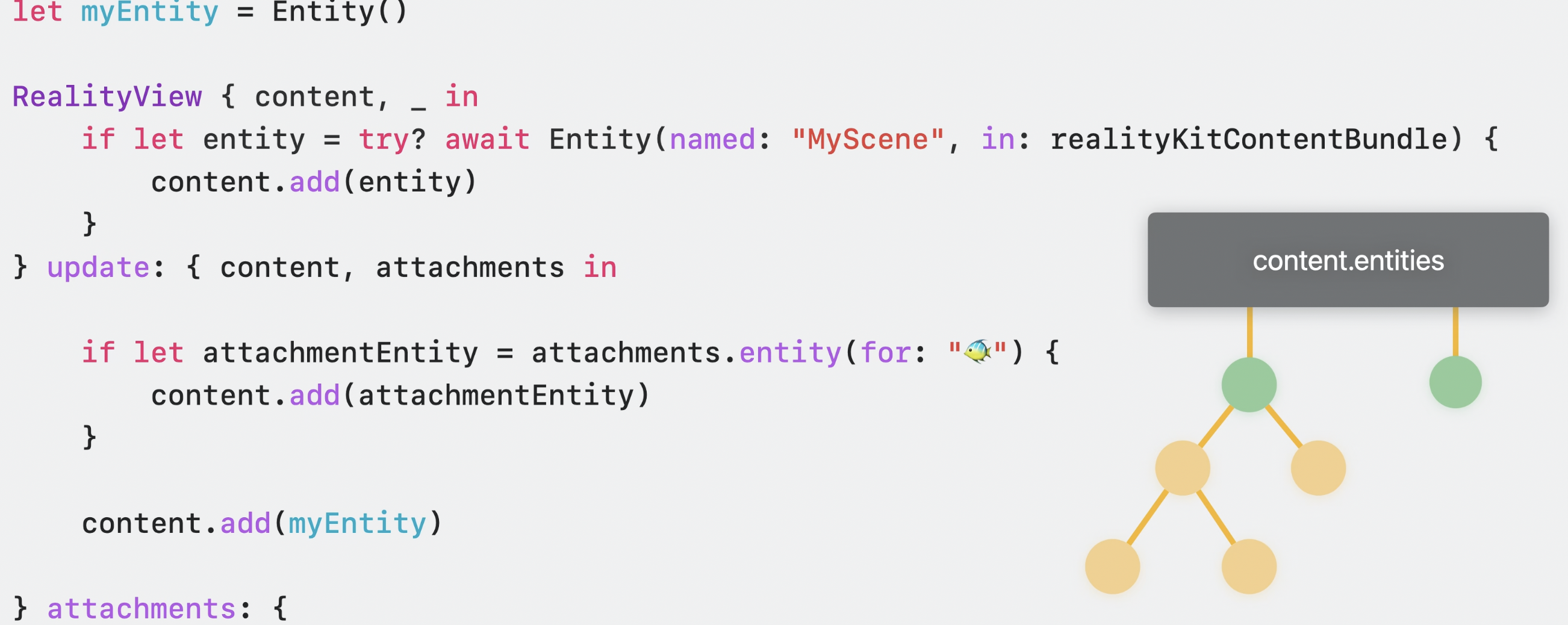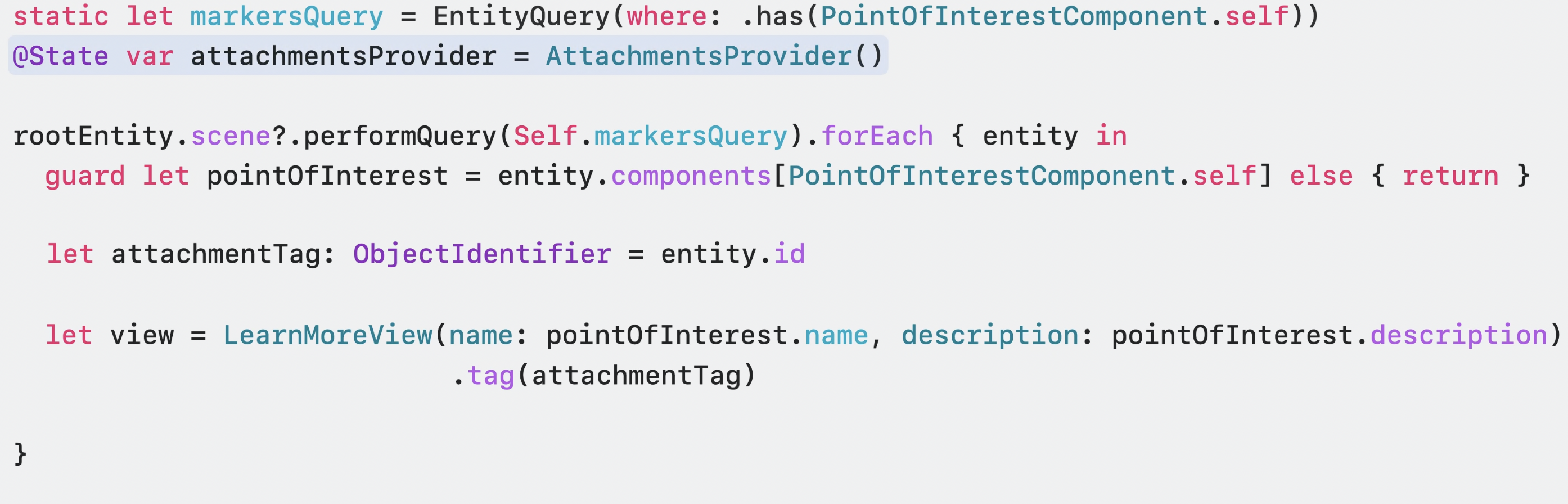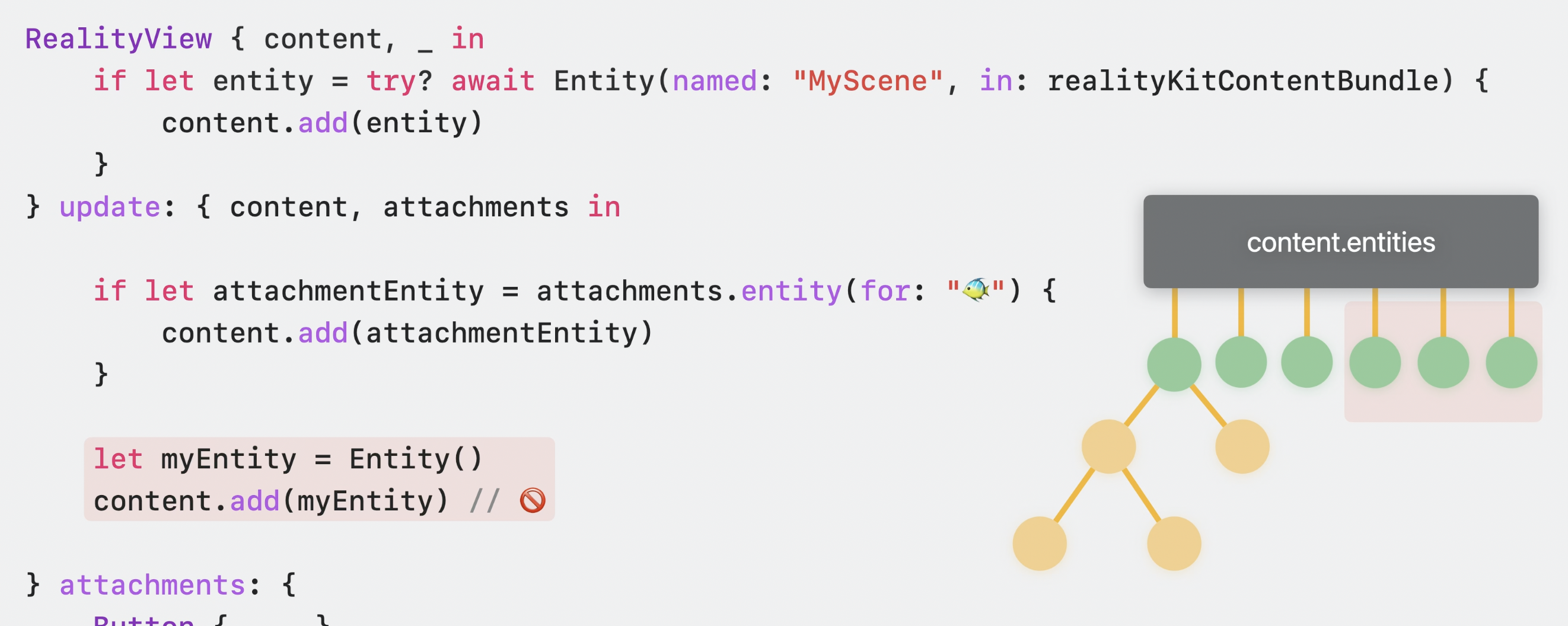 Attachment entity는 당신에 의해 생성되지 않고 attachments ViewBuilder에서 만든 attachment view에 대해 RealityView가 생성한다 .