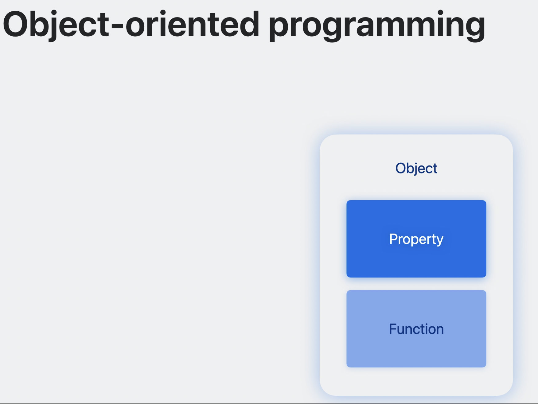 객체 지향 프로그래밍에서는 객체가 그 특성을 정의하는 속성인 프로퍼티를 가지고 자체 함수도 가지고 있다.