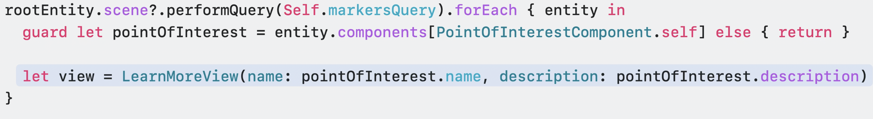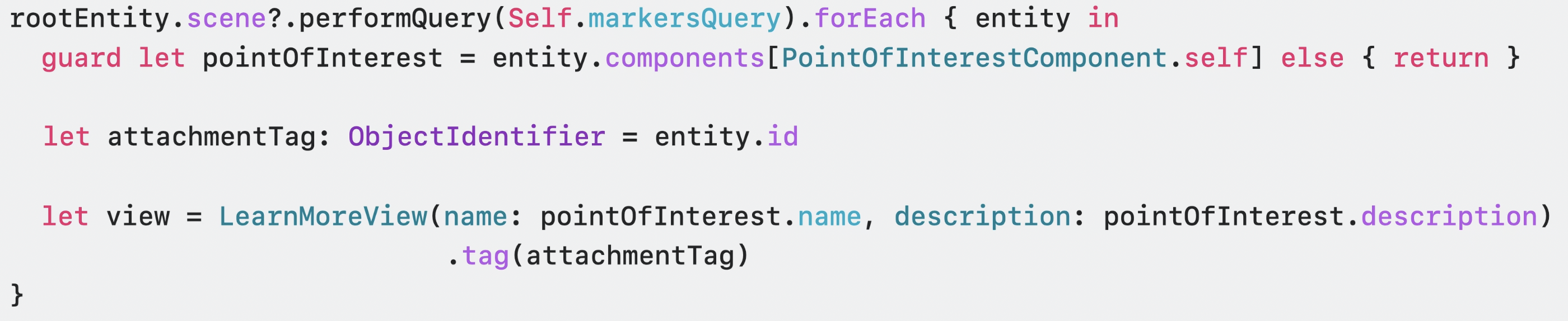 Query 결과를 반복하면서 scene의 각 entity에 대한 새로운 SwiftUI View를 생성한다.