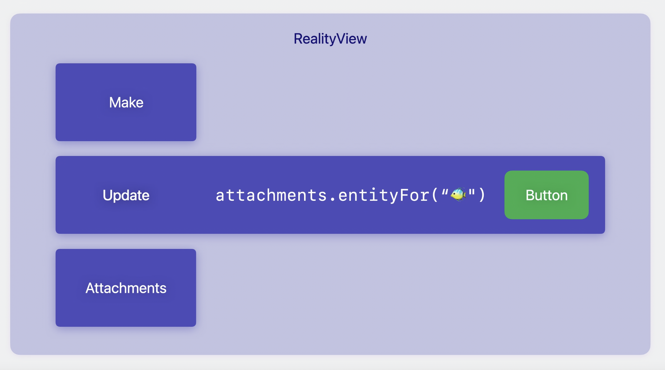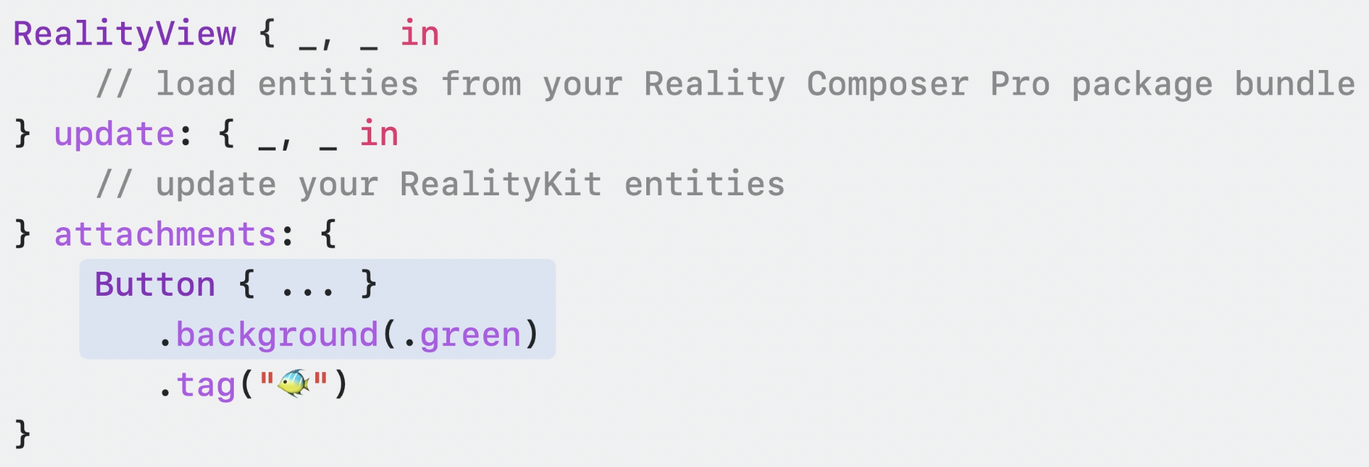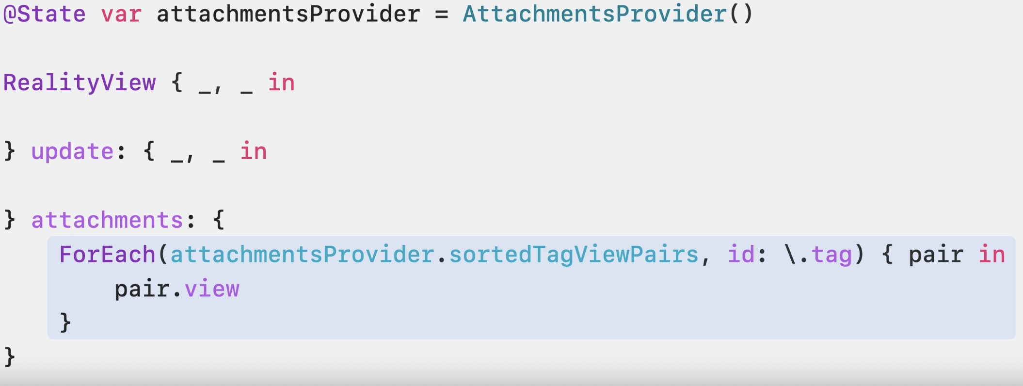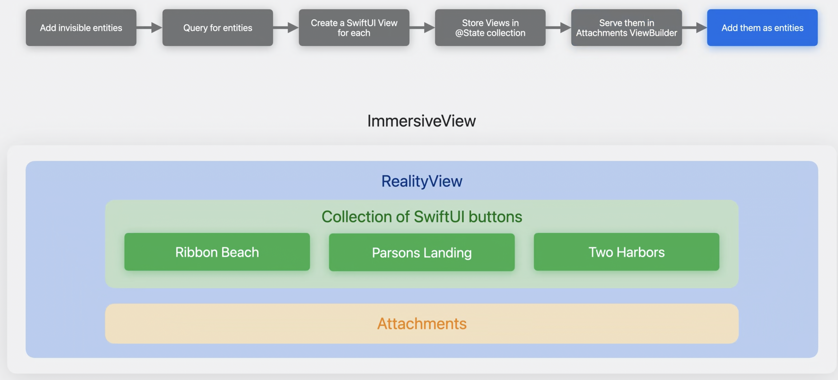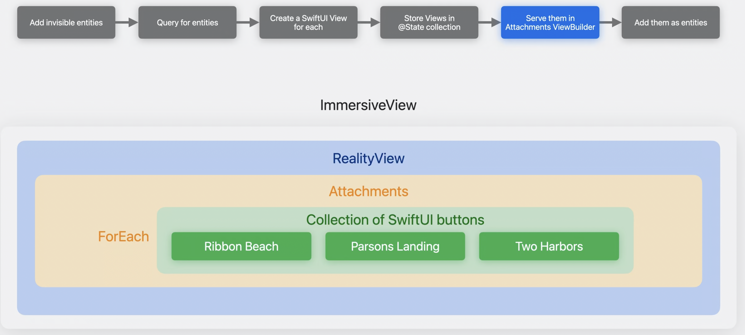 RealityView attachments ViewBuilder는 우리가 entity로 만들어졌으면하는 버튼들이 SwiftUI로 만들어졌으면 좋겠다고 선언한 곳이고