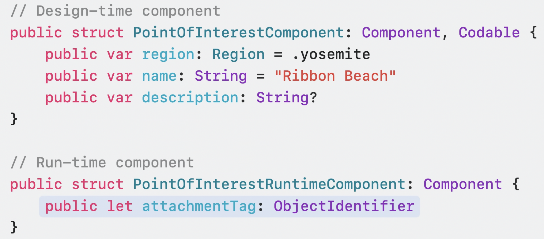 하나는 Reality Composer Pro에서 다루고 싶은 design-time data이고 하나는 런타임에 동적으로 같은 종류의 entity들에게 붙이고 싶은 runtime data이다. 후자 데이터는 Reality Composer Pro의 Inspector panel에서 보고 싶지 않은 것들을 위한 것이다.