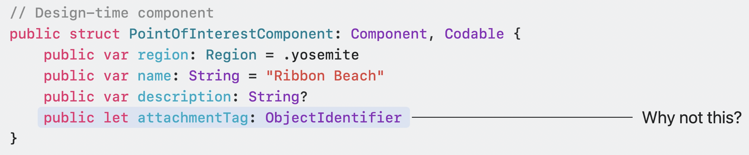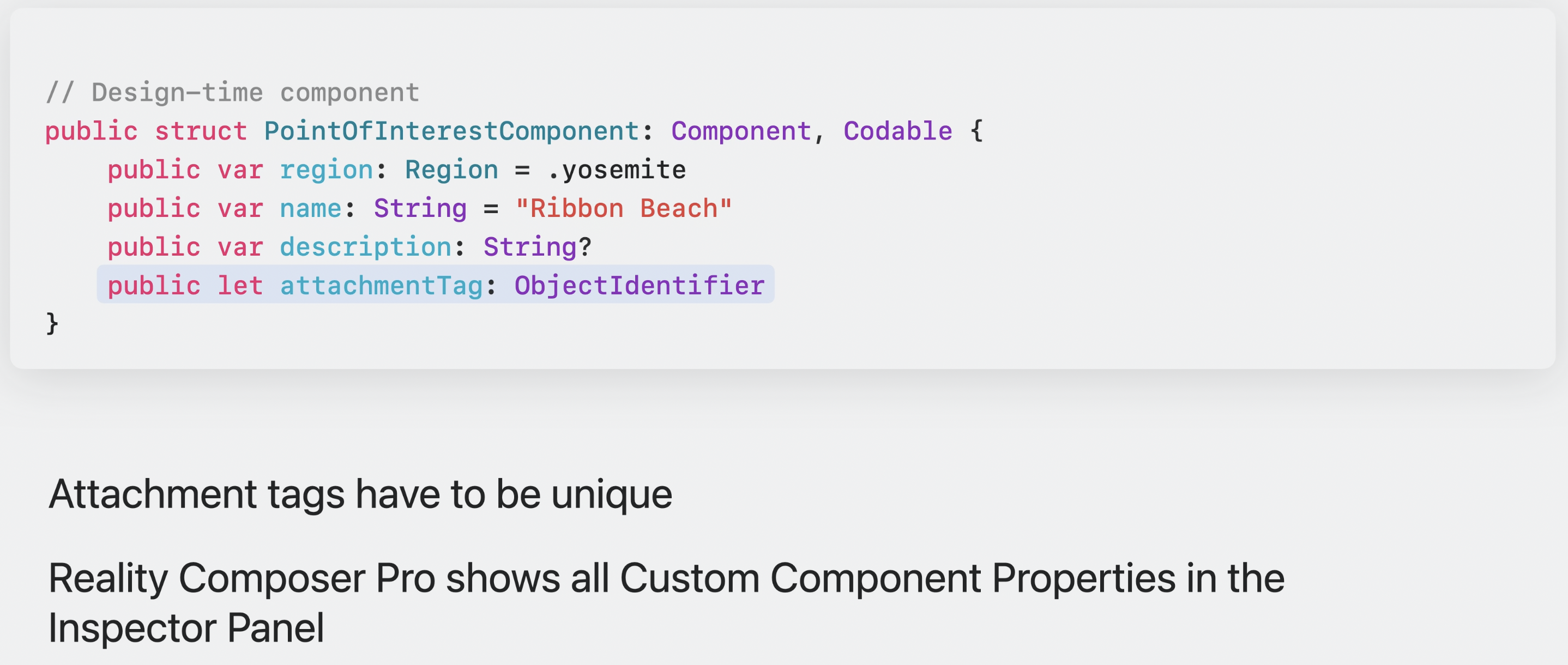 attachmentTag 프로퍼티를 reality composer pro에서 나타나지 않게 하려면 "design-time vs runtime components"라고 불리는 기술을 활용해야한다.