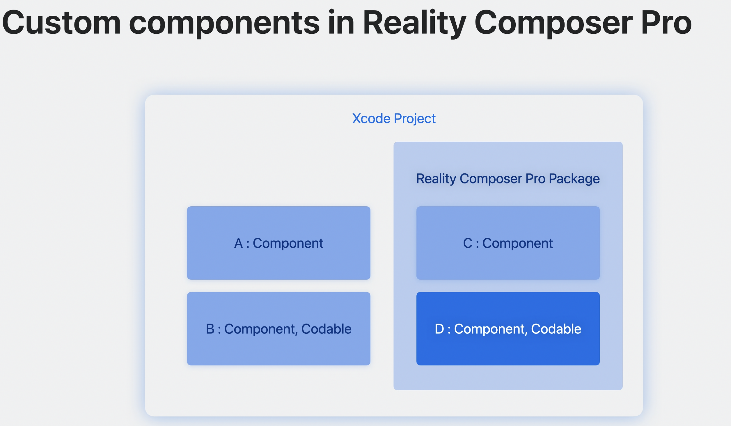결국 D만 Reality Composer Pro의 list에 표시되고, 이것이 design-time component가 된다. 그리고 반면에 다른 component들은 runtime component로 사용된다.