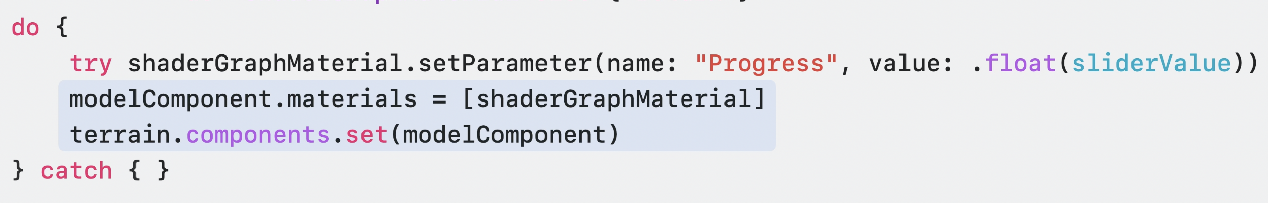 마지막으로 Material을 다시 ModelComponent에 저장하고 ModelComponent를 다시 terrain entity에 저장한다.