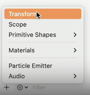 새로운 invisible entity를 만들기 위해 Reality Composer Pro 하단의 + 버튼을 눌러 Transform을 선택해준다.