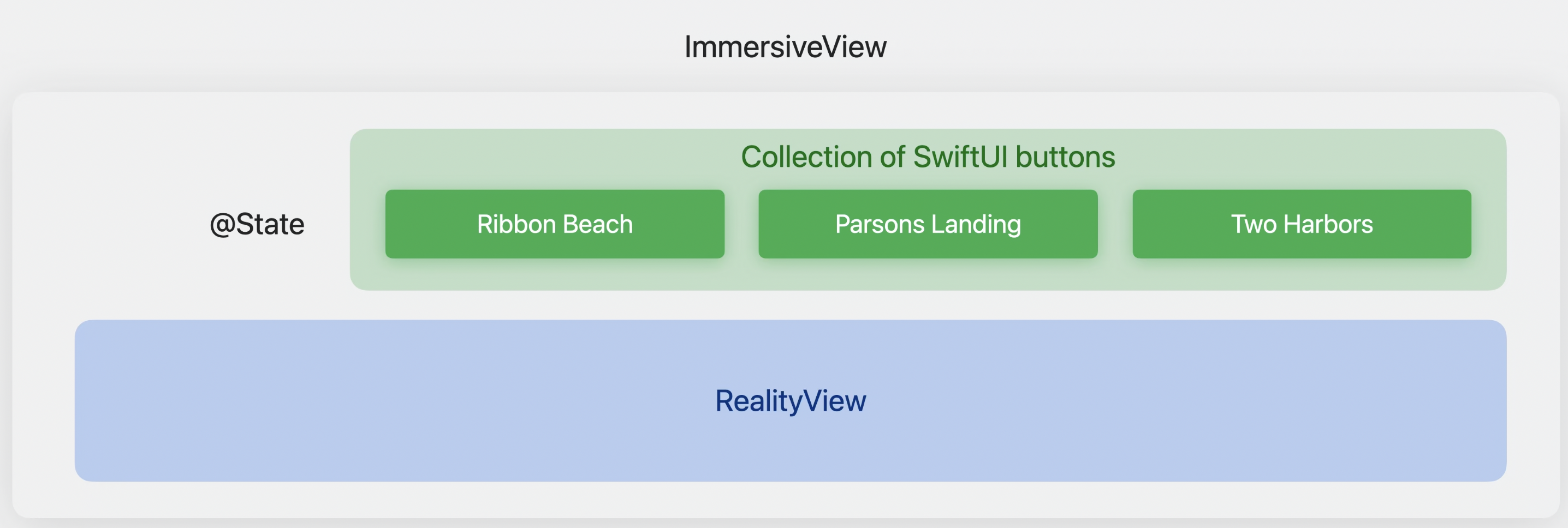 버튼을 RealityView로 가져오기 위해 property wrapper인 @State를 추가하여 SwiftUI의 view updating flow를 이용한다.