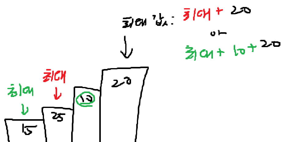 마지막 계단은 무조건 밟아야 하므로 마지막 계단에서의 최대점수를 그림으로 보면 다음과 같이 나옵니다.